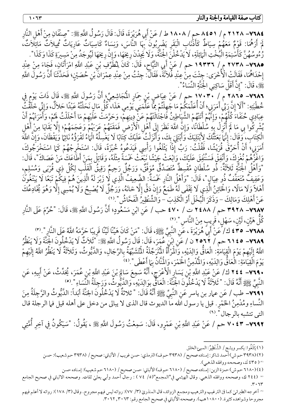 ٧٦٨٤ - ٢١٢٨ م / ٨٤٥١ حم / ١٨٠٨ ط / عَنْ أَبِي هُرَيْرَةَ، قَالَ: قَالَ رَسُولُ اللَّهِ - صلى الله عليه وسلم -: "صِنْفَانِ مِنْ أَهْلِ النَّارِ لَمْ أَرَهُمَا: قَوْمٌ مَعَهُمْ سِيَاطٌ كَأَذْنَابِ الْبَقَرِ يَضْرِبُونَ بِهَا النَّاسَ، وَنِسَاءٌ كَاسِيَاتٌ عَارِيَاتٌ مُمِيلَاتٌ مَائِلَاتٌ، رُءُوسُهُنَّ كَأَسْنِمَةِ الْبُخْتِ الْمَائِلَةِ، لَا يَدْخُلْنَ الْجَنَّةَ، وَلَا يَجِدْنَ رِيحَهَا، وَإِنَّ رِيحَهَا لَيُوجَدُ مِنْ مَسِيرَةِ كَذَا وَكَذَا".