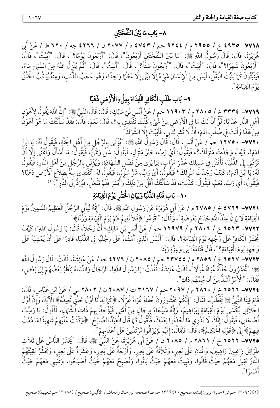 ٧٧٢٥ - ٦٥٢٢ خ / ٢٨٦١ م / ٢٠٨٥ ن / عَنْ أَبِي هُرَيْرَةَ، عَنْ النَّبِيِّ - صلى الله عليه وسلم -، قَالَ: "يُحْشَرُ النَّاسُ عَلَى ثَلَاثِ طَرَائِقَ رَاغِبِينَ رَاهِبِينَ، وَاثْنَانِ عَلَى بَعِيرٍ، وَثَلَاثَةٌ عَلَى بَعِيرٍ، وَأَرْبَعَةٌ عَلَى بَعِيرٍ، وَعَشَرَةٌ عَلَى بَعِيرٍ، وَيَحْشُرُ بَقِيَّتَهُمْ النَّارُ تَقِيلُ مَعَهُمْ حَيْثُ قَالُوا، وَتَبِيتُ مَعَهُمْ حَيْثُ بَاتُوا، وَتُصْبِحُ مَعَهُمْ حَيْثُ أَصْبَحُوا، وَتُمْسِي مَعَهُمْ حَيْثُ أَمْسَوْا".