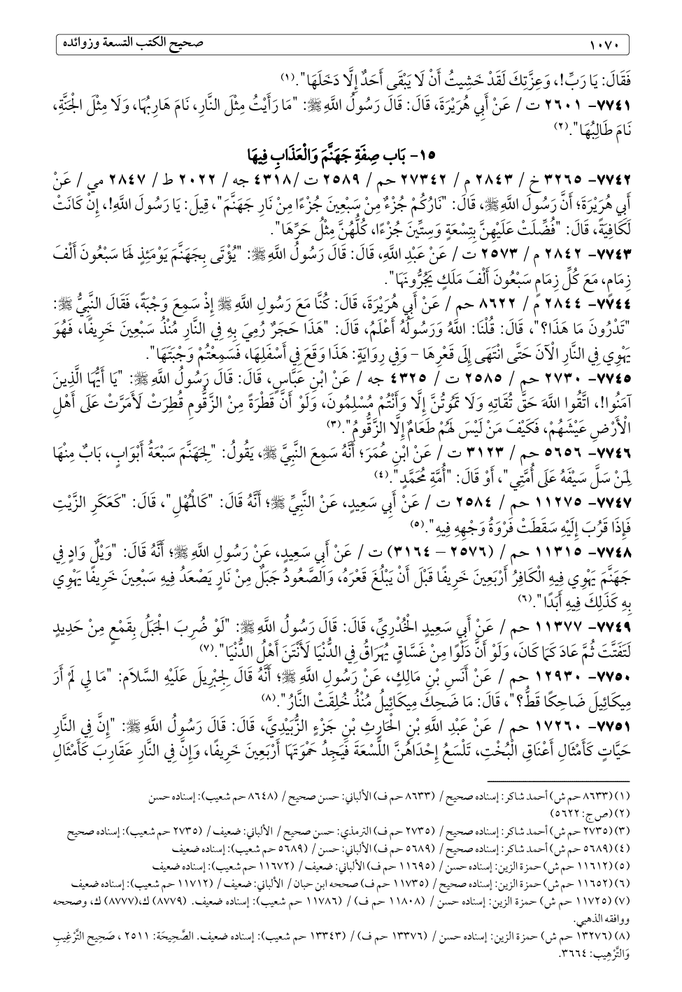 ٧٧٤٢ - ٣٢٦٥ خ / ٢٨٤٣ م / ٢٧٣٤٢ حم / ٢٥٨٩ ت /٤٣١٨ جه / ٢٠٢٢ ط / ٢٨٤٧ مي / عَنْ أَبِي هُرَيْرَةَ؛ أَنَّ رَسُولَ اللَّهِ - صلى الله عليه وسلم -، قَالَ: "نَارُكُمْ جُزْءٌ مِنْ سَبْعِينَ جُزْءًا مِنْ نَارِ جَهَنَّمَ"، قِيلَ: يَا رَسُولَ اللَّهِ!، إِنْ كَانَتْ لَكَافِيَةً، قَالَ: "فُضِّلَتْ عَلَيْهِنَّ بِتِسْعَةٍ وَسِتِّينَ جُزْءًا، كُلُّهُنَّ مِثْلُ حَرِّهَا".
