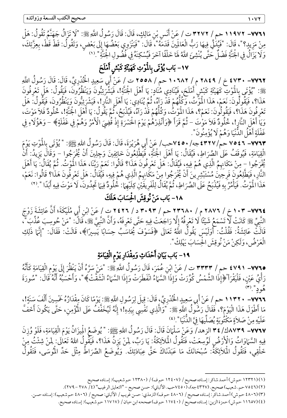 ٧٧٦٢ - ٤٧٣٠ خ / ٢٨٤٩ م / ١٠٦٨٢ حم / ٢٥٥٨ ت / عَنْ أَبِي سَعِيدٍ الْخُدْرِيِّ، قَالَ: قَالَ رَسُولُ اللَّهِ - صلى الله عليه وسلم -: "يُؤْتَى بِالْمَوْتِ كَهَيْئَةِ كَبْشٍ أَمْلَحَ، فَيُنَادِي مُنَادٍ: يَا أَهْلَ الْجَنَّةِ!، فَيَشْرَئِبُّونَ وَيَنْظُرُونَ، فَيَقُولُ: هَلْ تَعْرِفُونَ هَذَا؟، فَيَقُولُونَ: نَعَمْ، هَذَا الْمَوْتُ، وَكُلُّهُمْ قَدْ رَأَىهُ، ثُمَّ يُنَادِي: يَا أَهْلَ النَّارِ!، فَيَشْرَئِبُّونَ وَيَنْظُرُونَ، فَيَقُولُ: هَلْ تَعْرِفُونَ هَذَا؟، فَيَقُولُونَ: نَعَمْ؟، هَذَا الْمَوْتُ، وَكُلُّهُمْ قَدْ رَأَىهُ، فَيُذْبَحُ، ثُمَّ يَقُولُ: يَا أَهْلَ الْجَنَّةِ!، خُلُودٌ فَلَا مَوْتَ، وَيَا أَهْلَ النَّارِ!، خُلُودٌ فَلَا مَوْتَ - ثُمَّ قَرَأَ {وَأَنْذِرْهُمْ يَوْمَ الْحَسْرَةِ إِذْ قُضِيَ الْأَمْرُ وَهُمْ فِي غَفْلَةٍ} - وَهَؤُلَاءِ فِي غَفْلَةٍ أَهْلُ الدُّنْيَا وَهُمْ لَا يُؤْمِنُونَ".