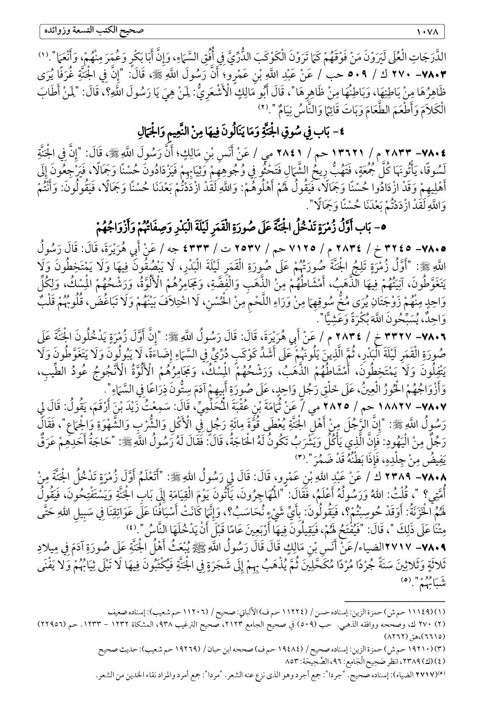 ٧٨٠٥ - ٣٢٤٥ خ / ٢٨٣٤ م / ٧١٢٥ حم / ٢٥٣٧ ت / ٤٣٣٣ جه / عَنْ أَبِي هُرَيْرَةَ، قَالَ: قَالَ رَسُولُ اللَّهِ - صلى الله عليه وسلم -: "أَوَّلُ زُمْرَةٍ تَلِجُ الْجَنَّةَ صُورَتُهُمْ عَلَى صُورَةِ الْقَمَرِ لَيْلَةَ الْبَدْرِ، لَا يَبْصُقُونَ فِيهَا وَلَا يَمْتَخِطُونَ وَلَا يَتَغَوَّطُونَ، آنِيَتُهُمْ فِيهَا الذَّهَبُ، أَمْشَاطُهُمْ مِنْ الذَّهَبِ وَالْفِضَّةِ، وَمَجَامِرُهُمْ الْأَلُوَّةُ، وَرَشْحُهُمْ الْمِسْكُ، وَلِكُلِّ وَاحِدٍ مِنْهُمْ زَوْجَتَانِ يُرَى مُخُّ سُوقِهِمَا مِنْ وَرَاءِ اللَّحْمِ مِنْ الْحُسْنِ، لَا اخْتِلَافَ بَيْنَهُمْ وَلَا تَبَاغُضَ، قُلُوبُهُمْ قَلْبٌ وَاحِدٌ، يُسَبِّحُونَ اللَّهَ بُكْرَةً وَعَشِيًّا".
