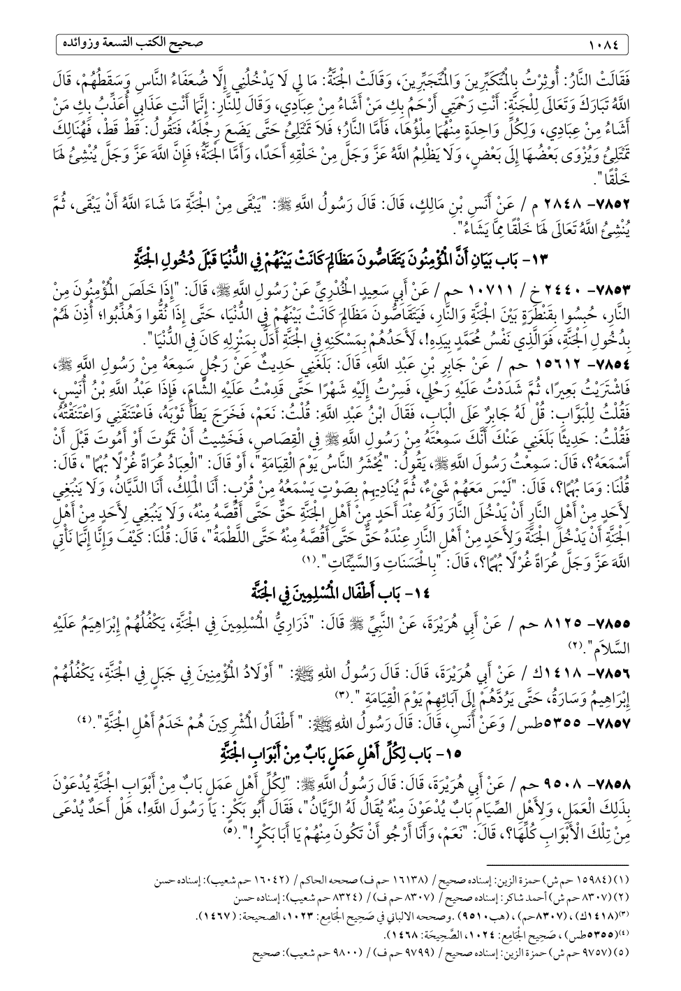 ٧٨٥٣ - ٢٤٤٠ خ / ١٠٧١١ حم / عَنْ أَبِي سَعِيدٍ الْخُدْرِيِّ عَنْ رَسُولِ اللَّهِ - صلى الله عليه وسلم -، قَالَ: "إِذَا خَلَصَ الْمُؤْمِنُونَ مِنْ النَّارِ، حُبِسُوا بِقَنْطَرَةٍ بَيْنَ الْجَنَّةِ وَالنَّارِ، فَيَتَقَاصُّونَ مَظَالِمَ كَانَتْ بَيْنَهُمْ فِي الدُّنْيَا، حَتَّى إِذَا نُقُّوا وَهُذِّبُوا؛ أُذِنَ لَهُمْ بِدُخُولِ الْجَنَّةِ، فَوَالَّذِي نَفْسُ مُحَمَّدٍ بِيَدِهِ!، لَأَحَدُهُمْ بِمَسْكَنِهِ فِي الْجَنَّةِ أَدَلُّ بِمَنْزِلِهِ كَانَ فِي الدُّنْيَا".