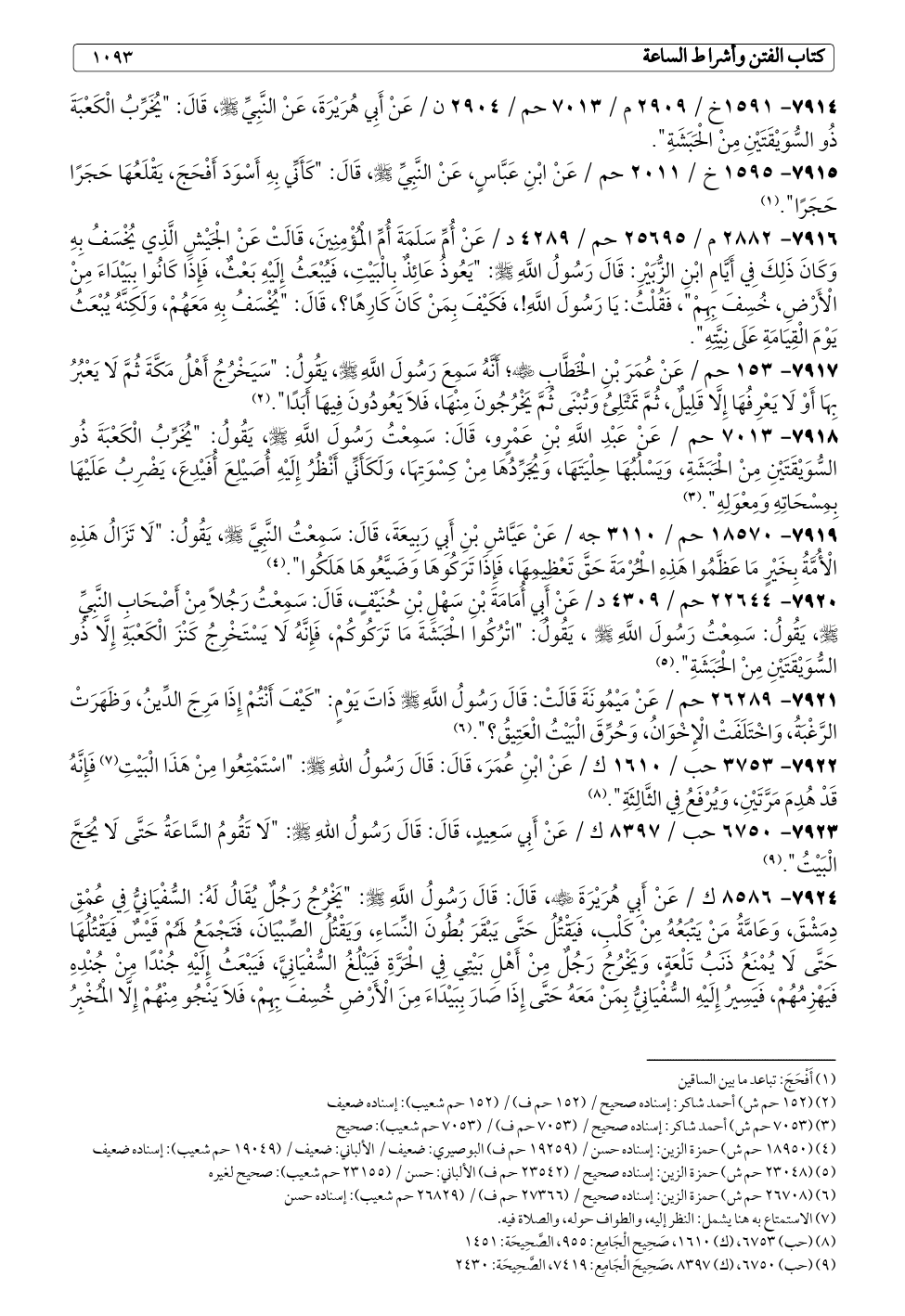 ٧٩١٤ - ١٥٩١ خ / ٢٩٠٩ م / ٧٠١٣ حم / ٢٩٠٤ ن / عَنْ أَبِي هُرَيْرَةَ، عَنْ النَّبِيِّ - صلى الله عليه وسلم -، قَالَ: "يُخَرِّبُ الْكَعْبَةَ ذُو السُّوَيْقَتَيْنِ مِنْ الْحَبَشَةِ".