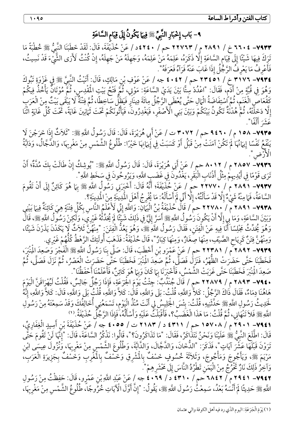 ٧٩٤١ - ٢٩٠١ م / ١٥٧٠٨ حم / ٤٣١١ د / ٢١٨٣ ت / ٤٠٥٥ جه / عَنْ حُذَيْفَةَ بْنِ أَسِيدٍ الْغِفَارِيِّ، قَالَ: اطَّلَعَ النَّبِيُّ - صلى الله عليه وسلم - عَلَيْنَا وَنَحْنُ نَتَذَاكَرُ، فَقَالَ: "مَا تَذَاكَرُونَ؟ "، قَالُوا: نَذْكُرُ السَّاعَةَ، قَالَ: "إِنَّهَا لَنْ تَقُومَ حَتَّى تَرَوْنَ قَبْلَهَا عَشْرَ آيَاتٍ"، فَذَكَرَ: "الدُّخَانَ، وَالدَّجَّالَ، وَالدَّابَّةَ، وَطُلُوعَ الشَّمْسِ مِنْ مَغْرِبِهَا، وَنُزُولَ عِيسَى ابْنِ مَرْيَمَ - صلى الله عليه وسلم -، وَيَأَجُوجَ وَمَأْجُوجَ، وَثَلَاثَةَ خُسُوفٍ خَسْفٌ بِالْمَشْرِقِ وَخَسْفٌ بِالْمَغْرِبِ وَخَسْفٌ بِجَزِيرَةِ الْعَرَبِ، وَآخِرُ ذَلِكَ نَارٌ تَخْرُجُ مِنْ الْيَمَنِ تَطْرُدُ النَّاسَ إِلَى مَحْشَرِهِمْ".