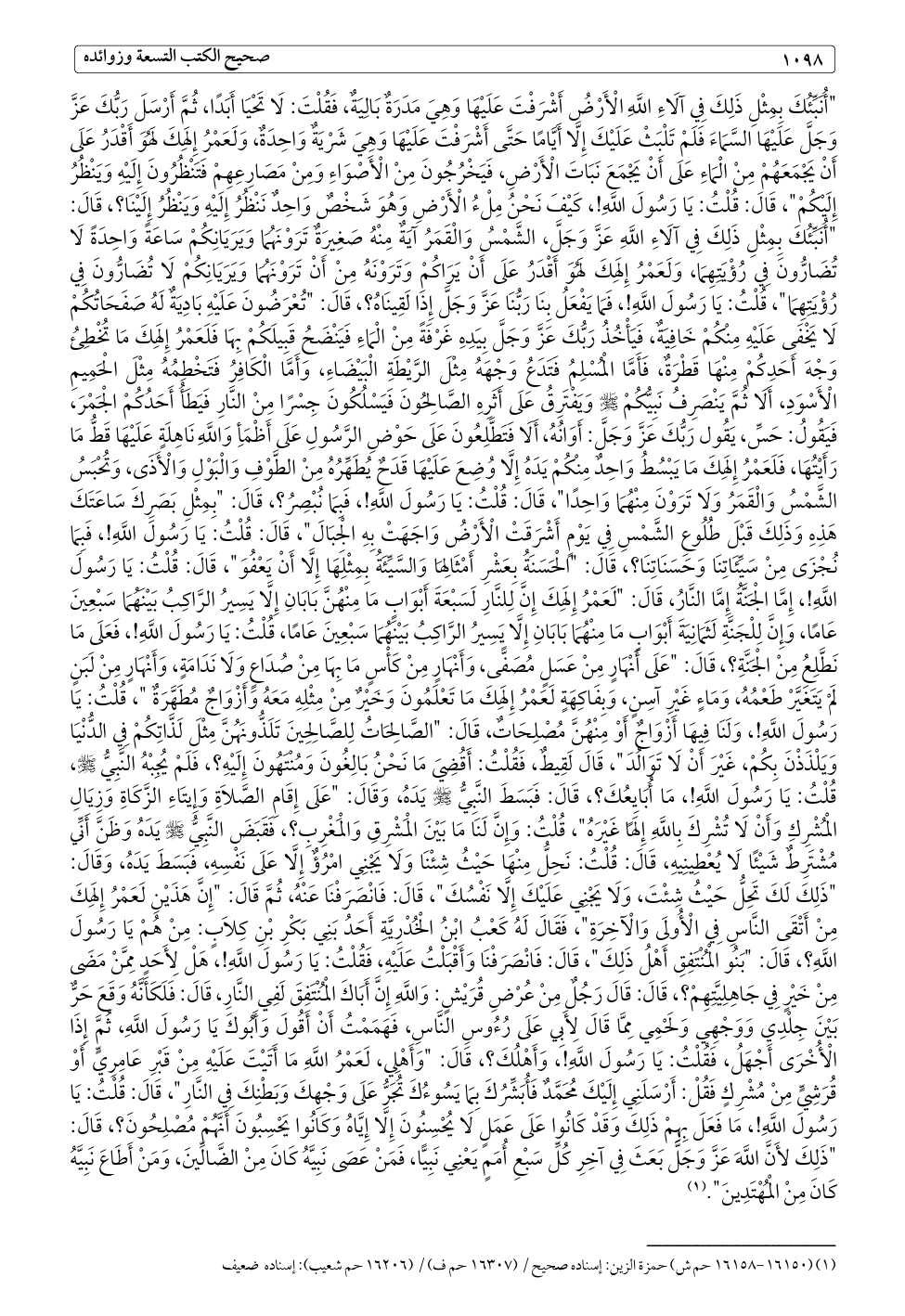 (¬١) (١٦١٥٠ - ١٦١٥٨ حم ش) حمزة الزين: إسناده صحيح / (١٦٣٠٧ حم ف) / (١٦٢٠٦ حم شعيب): إسناده ضعيف