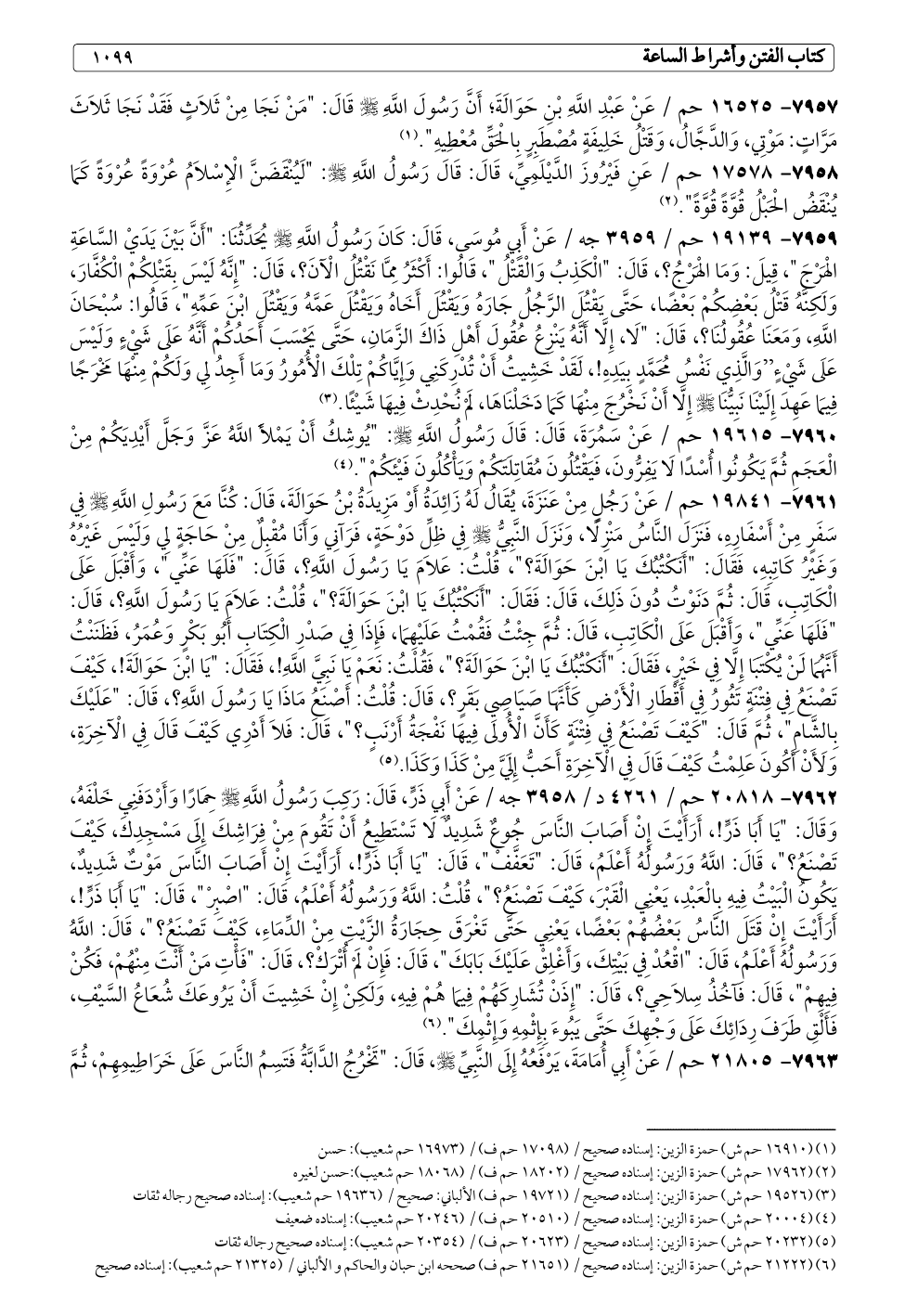 ٧٩٥٩ - ١٩١٣٩ حم / ٣٩٥٩ جه / عَنْ أَبِي مُوسَى، قَالَ: كَانَ رَسُولُ اللَّهِ - صلى الله عليه وسلم - يُحَدِّثُنَا: "أَنَّ بَيْنَ يَدَيْ السَّاعَةِ الْهَرْجَ"، قِيلَ: وَمَا الْهَرْجُ؟، قَالَ: "الْكَذِبُ وَالْقَتْلُ"، قَالُوا: أَكْثَرُ مِمَّا نَقْتُلُ الْآنَ؟، قَالَ: "إِنَّهُ لَيْسَ بِقَتْلِكُمْ الْكُفَّارَ، وَلَكِنَّهُ قَتْلُ بَعْضِكُمْ بَعْضًا، حَتَّى يَقْتُلَ الرَّجُلُ جَارَهُ وَيَقْتُلَ أَخَاهُ وَيَقْتُلَ عَمَّهُ وَيَقْتُلَ ابْنَ عَمِّهِ"، قَالُوا: سُبْحَانَ اللَّهِ، وَمَعَنَا عُقُولُنَا؟، قَالَ: "لَا، إِلَّا أَنَّهُ يَنْزِعُ عُقُولَ أَهْلِ ذَاكَ الزَّمَانِ، حَتَّى يَحْسَبَ أَحَدُكُمْ أَنَّهُ عَلَى شَيْءٍ وَلَيْسَ عَلَى شَيْءٍ"وَالَّذِي نَفْسُ مُحَمَّدٍ بِيَدِهِ!، لَقَدْ خَشِيتُ أَنْ تُدْرِكَنِي وَإِيَّاكُمْ تِلْكَ الْأُمُورُ وَمَا أَجِدُ لِي وَلَكُمْ مِنْهَا مَخْرَجًا فِيمَا عَهِدَ إِلَيْنَا نَبِيُّنَا - صلى الله عليه وسلم - إِلَّا أَنْ نَخْرُجَ مِنْهَا كَمَا دَخَلْنَاهَا، لَمْ نُحْدِثْ فِيهَا شَيْئًا. (¬٣)