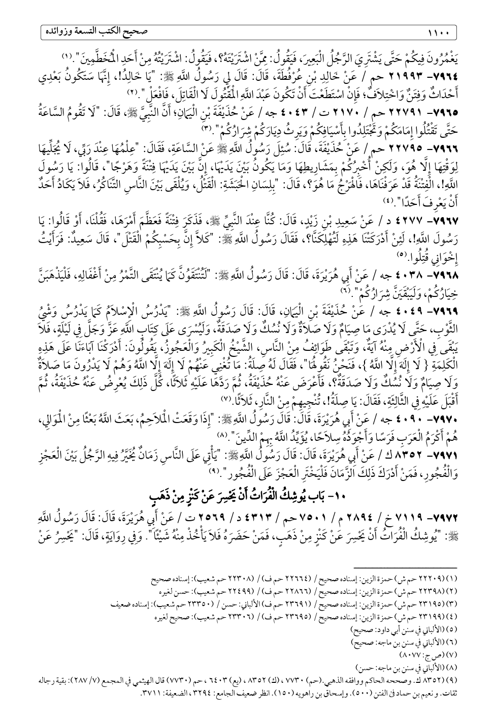 ٧٩٦٥ - ٢٢٧٩١ حم / ٢١٧٠ ت / ٤٠٤٣ جه / عَنْ حُذَيْفَةَ بْنِ الْيَمَانِ؛ أَنَّ النَّبِيَّ - صلى الله عليه وسلم -، قَالَ: "لَا تَقُومُ السَّاعَةُ حَتَّى تَقْتُلُوا إِمَامَكُمْ وَتَجْتَلِدُوا بِأَسْيَافِكُمْ وَيَرِثُ دِيَارَكُمْ شِرَارُكُمْ". (¬٣)