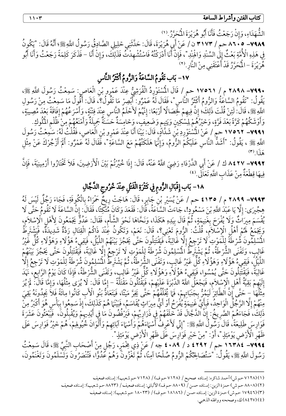 ١٨ - بَاب إِقْبَالِ الرُّومِ فِي كَثْرَةِ الْقَتْلِ عِنْدَ خُرُوجِ الدَّجَّالِ