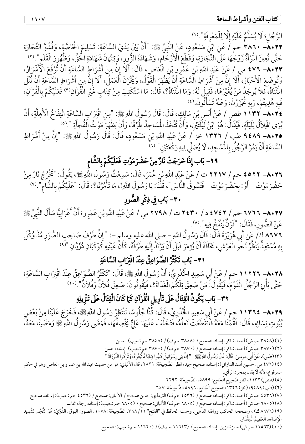 ٨٠٢٧ - ٦٧٦٦ حم / ٤٧٤٢ د / ٢٤٣٠ ت / ٢٧٩٨ مي / عَنْ عَبْدِ اللَّهِ بْنِ عَمْرٍو؛ أَنَّ أَعْرَابِيًّا سَأَلَ النَّبِيَّ - صلى الله عليه وسلم - عَنْ الصُّورِ، فَقَالَ: "قَرْنٌ يُنْفَخُ فِيهِ". (¬٨).