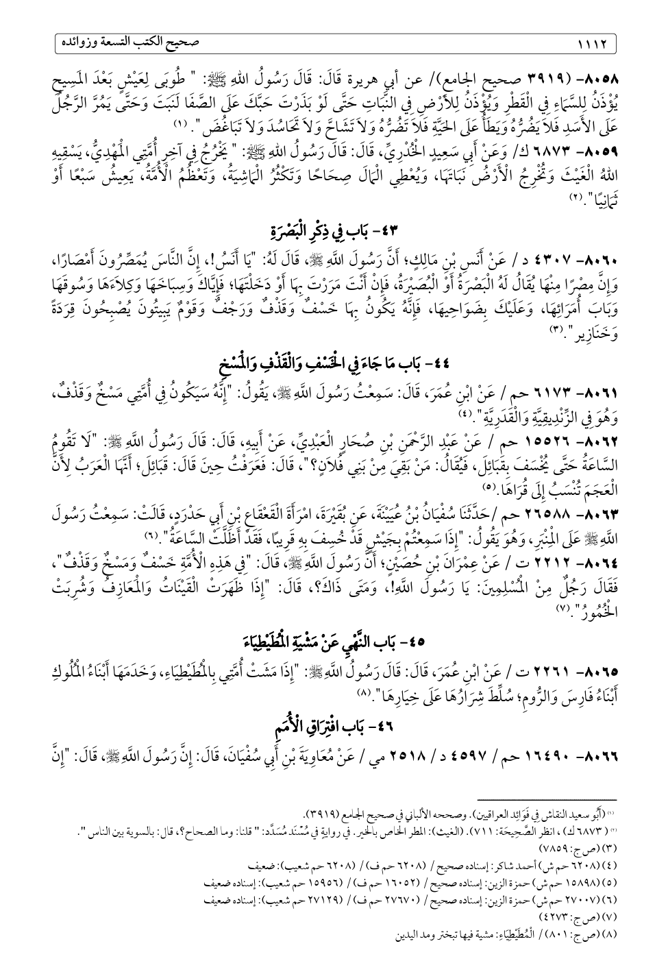 ٨٠٦٥ - ٢٢٦١ ت / عَنْ ابْنِ عُمَرَ، قَالَ: قَالَ رَسُولُ اللَّهِ - صلى الله عليه وسلم -: "إِذَا مَشَتْ أُمَّتِي بِالْمُطَيْطِيَاءِ، وَخَدَمَهَا أَبْنَاءُ الْمُلُوكِ أَبْنَاءُ فَارِسَ وَالرُّومِ؛ سُلِّطَ شِرَارُهَا عَلَى خِيَارِهَا". (¬٨)