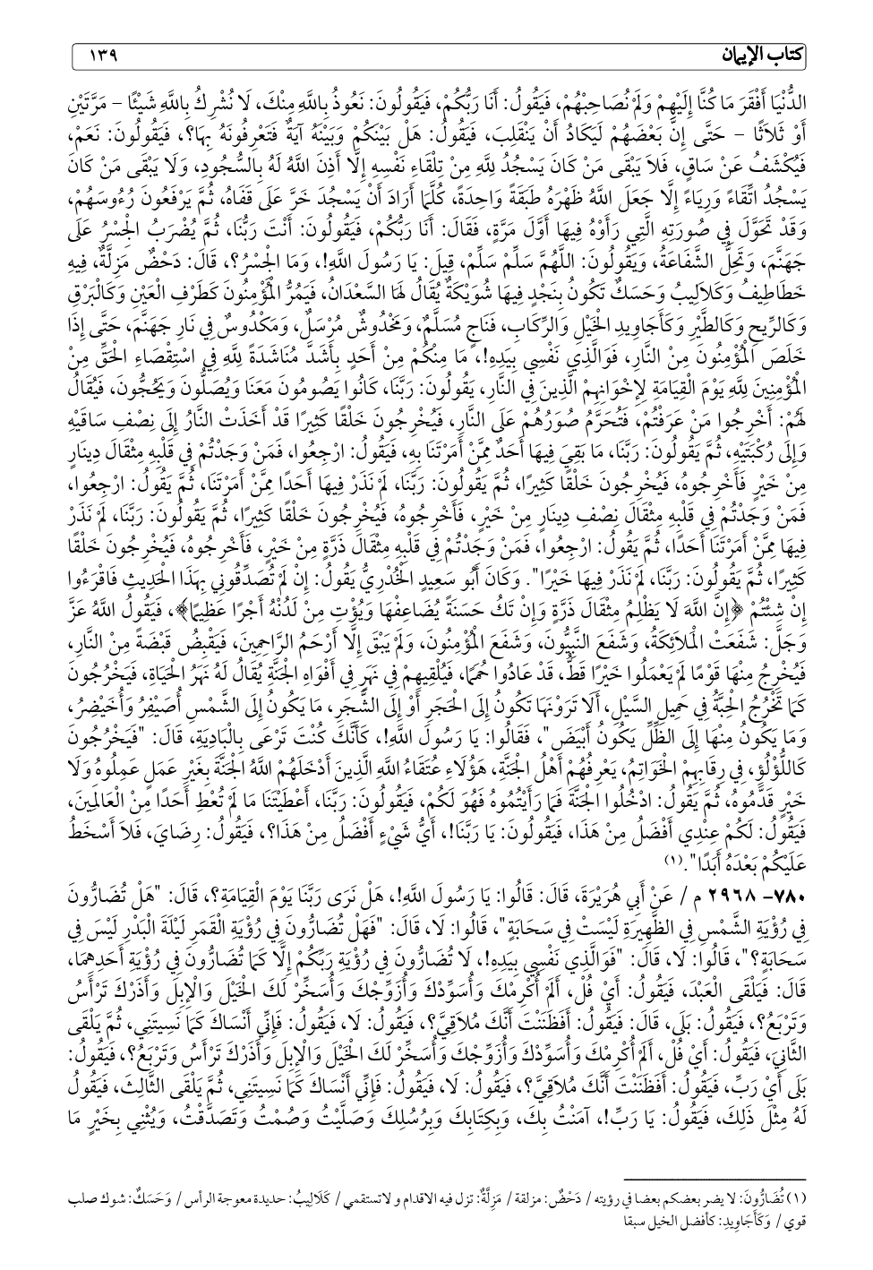 ٧٨٠ - ٢٩٦٨ م / عَنْ أَبِي هُرَيْرَةَ، قَالَ: قَالُوا: يَا رَسُولَ اللَّهِ!، هَلْ نَرَى رَبَّنَا يَوْمَ الْقِيَامَةِ؟، قَالَ: "هَلْ تُضَارُّونَ فِي رُؤْيَةِ الشَّمْسِ فِي الظَّهِيرَةِ لَيْسَتْ فِي سَحَابَةٍ"، قَالُوا: لَا، قَالَ: "فَهَلْ تُضَارُّونَ فِي رُؤْيَةِ الْقَمَرِ لَيْلَةَ الْبَدْرِ لَيْسَ فِي سَحَابَةٍ؟ "، قَالُوا: لَا، قَالَ: "فَوَالَّذِي نَفْسِي بِيَدِهِ!، لَا تُضَارُّونَ فِي رُؤْيَةِ رَبِّكُمْ إِلَّا كَمَا تُضَارُّونَ فِي رُؤْيَةِ أَحَدِهِمَا، قَالَ: فَيَلْقَى الْعَبْدَ، فَيَقُولُ: أَيْ فُلْ، أَلَمْ أُكْرِمْكَ وَأُسَوِّدْكَ وَأُزَوِّجْكَ وَأُسَخِّرْ لَكَ الْخَيْلَ وَالْإِبِلَ وَأَذَرْكَ تَرْأَسُ وَتَرْبَعُ؟، فَيَقُولُ: بَلَى، قَالَ: فَيَقُولُ: أَفَظَنَنْتَ أَنَّكَ مُلَاقِيَّ؟، فَيَقُولُ: لَا، فَيَقُولُ: فَإِنِّي أَنْسَاكَ كَمَا نَسِيتَنِي، ثُمَّ يَلْقَى الثَّانِيَ، فَيَقُولُ: أَيْ فُلْ، أَلَمْ أُكْرِمْكَ وَأُسَوِّدْكَ وَأُزَوِّجْكَ وَأُسَخِّرْ لَكَ الْخَيْلَ وَالْإِبِلَ وَأَذَرْكَ تَرْأَسُ وَتَرْبَعُ؟، فَيَقُولُ: بَلَى أَيْ رَبِّ، فَيَقُولُ: أَفَظَنَنْتَ أَنَّكَ مُلَاقِيَّ؟، فَيَقُولُ: لَا، فَيَقُولُ: فَإِنِّي أَنْسَاكَ كَمَا نَسِيتَنِي، ثُمَّ يَلْقَى الثَّالِثَ، فَيَقُولُ لَهُ مِثْلَ ذَلِكَ، فَيَقُولُ: يَا رَبِّ!، آمَنْتُ بِكَ، وَبِكِتَابِكَ وَبِرُسُلِكَ وَصَلَّيْتُ وَصُمْتُ وَتَصَدَّقْتُ، وَيُثْنِي بِخَيْرٍ مَا