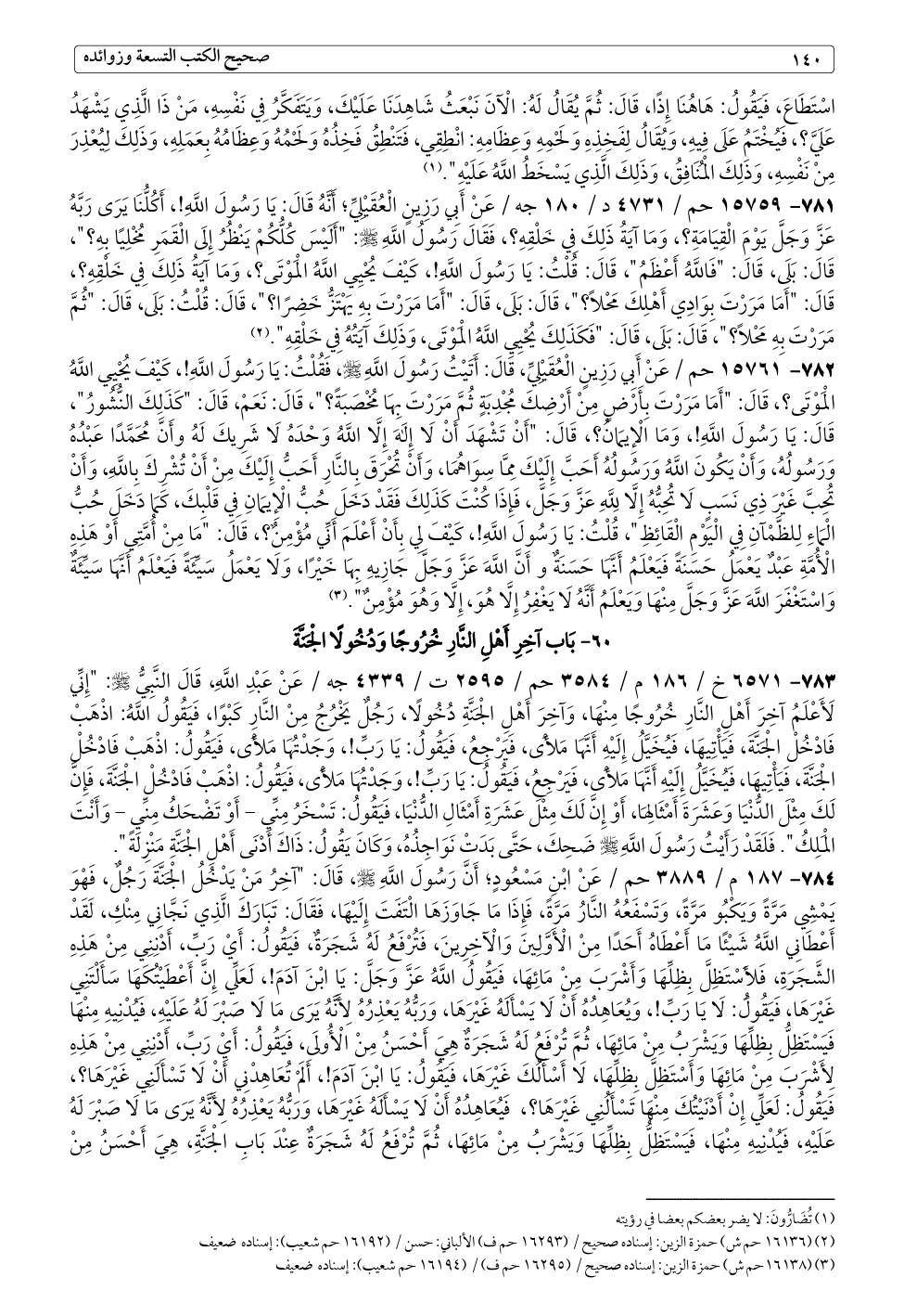٧٨٤ - ١٨٧ م / ٣٨٨٩ حم / عَنْ ابْنِ مَسْعُودٍ؛ أَنَّ رَسُولَ اللَّهِ - صلى الله عليه وسلم -، قَالَ: "آخِرُ مَنْ يَدْخُلُ الْجَنَّةَ رَجُلٌ، فَهْوَ يَمْشِي مَرَّةً وَيَكْبُو مَرَّةً، وَتَسْفَعُهُ النَّارُ مَرَّةً، فَإِذَا مَا جَاوَزَهَا الْتَفَتَ إِلَيْهَا، فَقَالَ: تَبَارَكَ الَّذِي نَجَّانِي مِنْكِ، لَقَدْ أَعْطَانِي اللَّهُ شَيْئًا مَا أَعْطَاهُ أَحَدًا مِنْ الْأَوَّلِينَ وَالْآخِرِينَ، فَتُرْفَعُ لَهُ شَجَرَةٌ، فَيَقُولُ: أَيْ رَبِّ، أَدْنِنِي مِنْ هَذِهِ الشَّجَرَةِ، فَلِأَسْتَظِلَّ بِظِلِّهَا وَأَشْرَبَ مِنْ مَائِهَا، فَيَقُولُ اللَّهُ عَزَّ وَجَلَّ: يَا ابْنَ آدَمَ!، لَعَلِّي إِنَّ أَعْطَيْتُكَهَا سَأَلْتَنِي غَيْرَهَا، فَيَقُولُ: لَا يَا رَبِّ!، وَيُعَاهِدُهُ أَنْ لَا يَسْأَلَهُ غَيْرَهَا، وَرَبُّهُ يَعْذِرُهُ لِأَنَّهُ يَرَى مَا لَا صَبْرَ لَهُ عَلَيْهِ، فَيُدْنِيهِ مِنْهَا فَيَسْتَظِلُّ بِظِلِّهَا وَيَشْرَبُ مِنْ مَائِهَا، ثُمَّ تُرْفَعُ لَهُ شَجَرَةٌ هِيَ أَحْسَنُ مِنْ الْأُولَى، فَيَقُولُ: أَيْ رَبِّ، أَدْنِنِي مِنْ هَذِهِ لِأَشْرَبَ مِنْ مَائِهَا وَأَسْتَظِلَّ بِظِلِّهَا، لَا أَسْأَلُكَ غَيْرَهَا، فَيَقُولُ: يَا ابْنَ آدَمَ!، أَلَمْ تُعَاهِدْنِي أَنْ لَا تَسْأَلَنِي غَيْرَهَا؟، فَيَقُولُ: لَعَلِّي إِنْ أَدْنَيْتُكَ مِنْهَا تَسْأَلُنِي غَيْرَهَا؟، فَيُعَاهِدُهُ أَنْ لَا يَسْأَلَهُ غَيْرَهَا، وَرَبُّهُ يَعْذِرُهُ لِأَنَّهُ يَرَى مَا لَا صَبْرَ لَهُ عَلَيْهِ، فَيُدْنِيهِ مِنْهَا، فَيَسْتَظِلُّ بِظِلِّهَا وَيَشْرَبُ مِنْ مَائِهَا، ثُمَّ تُرْفَعُ لَهُ شَجَرَةٌ عِنْدَ بَابِ الْجَنَّةِ، هِيَ أَحْسَنُ مِنْ