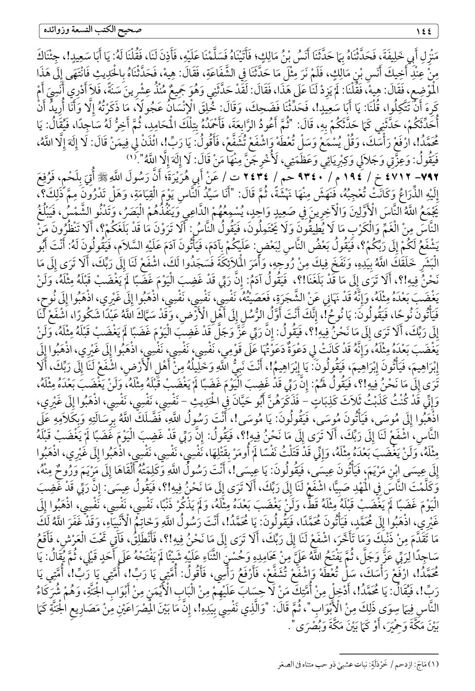 ٧٩٢ - ٤٧١٢ خ / ١٩٤ م / ٩٣٤٠ حم / ٢٤٣٤ ت / عَنْ أَبِي هُرَيْرَةَ؛ أَنَّ رَسُولَ اللَّهِ - صلى الله عليه وسلم - أُتِيَ بِلَحْمٍ، فَرُفِعَ إِلَيْهِ الذِّرَاعُ وَكَانَتْ تُعْجِبُهُ، فَنَهَشَ مِنْهَا نَهْشَةً، ثُمَّ قَالَ: "أَنَا سَيِّدُ النَّاسِ يَوْمَ الْقِيَامَةِ، وَهَلْ تَدْرُونَ مِمَّ ذَلِكَ؟، يَجْمَعُ اللَّهُ النَّاسَ الْأَوَّلِينَ وَالْآخِرِينَ فِي صَعِيدٍ وَاحِدٍ، يُسْمِعُهُمْ الدَّاعِي وَيَنْفُذُهُمْ الْبَصَرُ، وَتَدْنُو الشَّمْسُ، فَيَبْلُغُ النَّاسَ مِنْ الْغَمِّ وَالْكَرْبِ مَا لَا يُطِيقُونَ وَلَا يَحْتَمِلُونَ، فَيَقُولُ النَّاسُ: أَلَا تَرَوْنَ مَا قَدْ بَلَغَكُمْ؟، أَلَا تَنْظُرُونَ مَنْ يَشْفَعُ لَكُمْ إِلَى رَبِّكُمْ؟، فَيَقُولُ بَعْضُ النَّاسِ لِبَعْضٍ: عَلَيْكُمْ بِآدَمَ، فَيَأْتُونَ آدَمَ عَلَيْهِ السَّلَام، فَيَقُولُونَ لَهُ: أَنْتَ أَبُو الْبَشَرِ خَلَقَكَ اللَّهُ بِيَدِهِ، وَنَفَخَ فِيكَ مِنْ رُوحِهِ، وَأَمَرَ الْمَلَائِكَةَ فَسَجَدُوا لَكَ، اشْفَعْ لَنَا إِلَى رَبِّكَ، أَلَا تَرَى إِلَى مَا نَحْنُ فِيهِ!؟، أَلَا تَرَى إِلَى مَا قَدْ بَلَغَنَا!؟، فَيَقُولُ آدَمُ: إِنَّ رَبِّي قَدْ غَضِبَ الْيَوْمَ غَضَبًا لَمْ يَغْضَبْ قَبْلَهُ مِثْلَهُ، وَلَنْ يَغْضَبَ بَعْدَهُ مِثْلَهُ، وَإِنَّهُ قَدْ نَهَانِي عَنْ الشَّجَرَةِ، فَعَصَيْتُهُ، نَفْسِي، نَفْسِي، نَفْسِي، اذْهَبُوا إِلَى غَيْرِي، اذْهَبُوا إِلَى نُوحٍ، فَيَأْتُونَ نُوحًا، فَيَقُولُونَ: يَا نُوحُ!، إِنَّكَ أَنْتَ أَوَّلُ الرُّسُلِ إِلَى أَهْلِ الْأَرْضِ، وَقَدْ سَمَّاكَ اللَّهُ عَبْدًا شَكُورًا، اشْفَعْ لَنَا إِلَى رَبِّكَ، أَلَا تَرَى إِلَى مَا نَحْنُ فِيهِ!؟، فَيَقُولُ: إِنَّ رَبِّي عَزَّ وَجَلَّ قَدْ غَضِبَ الْيَوْمَ غَضَبًا لَمْ