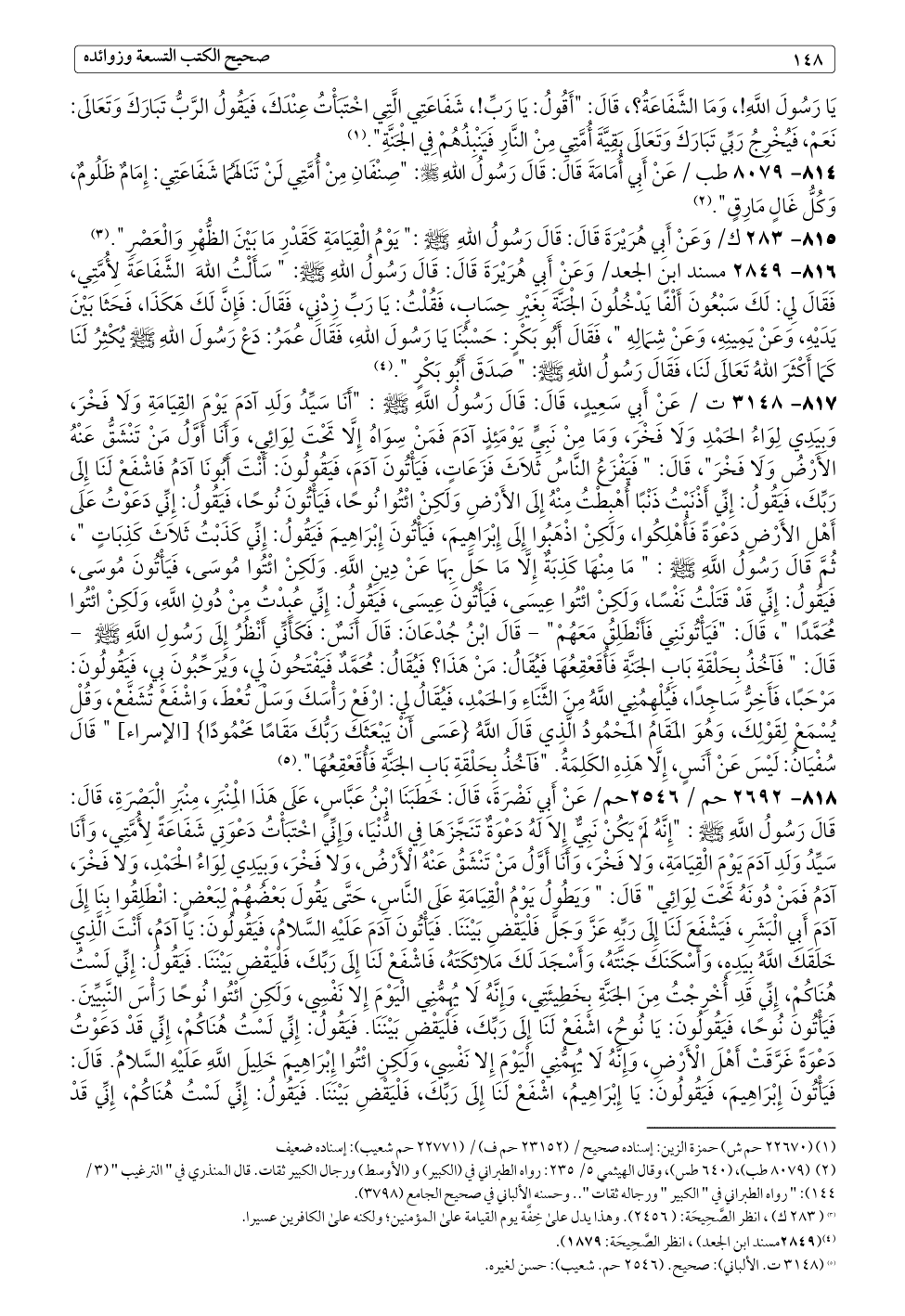 ٨١٧ - ٣١٤٨ ت / عَنْ أَبِي سَعِيدٍ، قَالَ: قَالَ رَسُولُ اللَّهِ - صلى الله عليه وسلم -: "أَنَا سَيِّدُ وَلَدِ آدَمَ يَوْمَ القِيَامَةِ وَلَا فَخْرَ، وَبِيَدِي لِوَاءُ الحَمْدِ وَلَا فَخْرَ، وَمَا مِنْ نَبِيٍّ يَوْمَئِذٍ آدَمَ فَمَنْ سِوَاهُ إِلَّا تَحْتَ لِوَائِي، وَأَنَا أَوَّلُ مَنْ تَنْشَقُّ عَنْهُ الأَرْضُ وَلَا فَخْرَ"، قَالَ: " فَيَفْزَعُ النَّاسُ ثَلَاثَ فَزَعَاتٍ، فَيَأْتُونَ آدَمَ، فَيَقُولُونَ: أَنْتَ أَبُونَا آدَمُ فَاشْفَعْ لَنَا إِلَى رَبِّكَ، فَيَقُولُ: إِنِّي أَذْنَبْتُ ذَنْبًا أُهْبِطْتُ مِنْهُ إِلَى الأَرْضِ وَلَكِنْ ائْتُوا نُوحًا، فَيَأْتُونَ نُوحًا، فَيَقُولُ: إِنِّي دَعَوْتُ عَلَى أَهْلِ الأَرْضِ دَعْوَةً فَأُهْلِكُوا، وَلَكِنْ اذْهَبُوا إِلَى إِبْرَاهِيمَ، فَيَأْتُونَ إِبْرَاهِيمَ فَيَقُولُ: إِنِّي كَذَبْتُ ثَلَاثَ كَذِبَاتٍ "، ثُمَّ قَالَ رَسُولُ اللَّهِ - صلى الله عليه وسلم -: " مَا مِنْهَا كَذِبَةٌ إِلَّا مَا حَلَّ بِهَا عَنْ دِينِ اللَّهِ.
