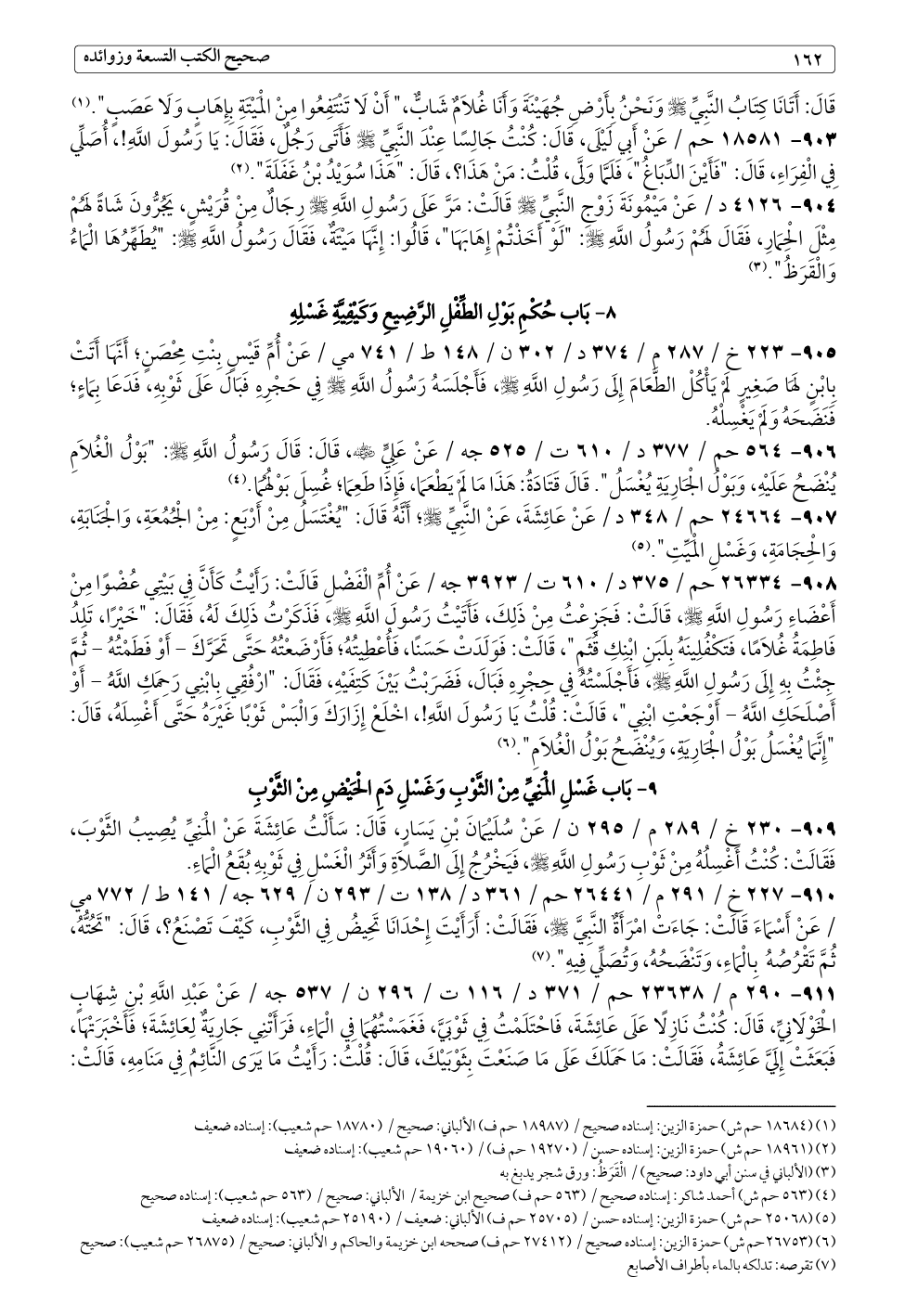 ٩٠٥ - ٢٢٣ خ / ٢٨٧ م / ٣٧٤ د / ٣٠٢ ن / ١٤٨ ط / ٧٤١ مي / عَنْ أُمِّ قَيْسٍ بِنْتِ مِحْصَنٍ؛ أَنَّهَا أَتَتْ بِابْنٍ لَهَا صَغِيرٍ لَمْ يَأْكُلْ الطَّعَامَ إِلَى رَسُولِ اللَّهِ - صلى الله عليه وسلم -، فَأَجْلَسَهُ رَسُولُ اللَّهِ - صلى الله عليه وسلم - فِي حَجْرِهِ فَبَالَ عَلَى ثَوْبِهِ، فَدَعَا بِمَاءٍ؛ فَنَضَحَهُ وَلَمْ يَغْسِلْهُ.