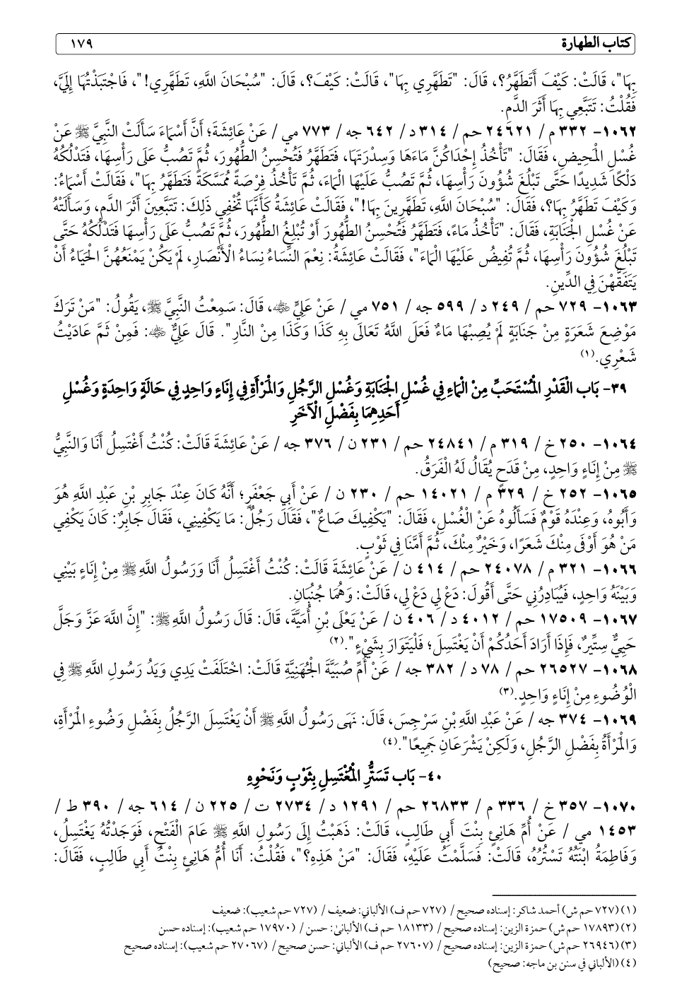 ١٠٦٢ - ٣٣٢ م / ٢٤٦٢١ حم / ٣١٤ د / ٦٤٢ جه / ٧٧٣ مي / عَنْ عَائِشَةَ؛ أَنَّ أَسْمَاءَ سَأَلَتْ النَّبِيَّ - صلى الله عليه وسلم - عَنْ غُسْلِ الْمَحِيضِ، فَقَالَ: "تَأْخُذُ إِحْدَاكُنَّ مَاءَهَا وَسِدْرَتَهَا، فَتَطَهَّرُ فَتُحْسِنُ الطُّهُورَ، ثُمَّ تَصُبُّ عَلَى رَأْسِهَا، فَتَدْلُكُهُ دَلْكًا شَدِيدًا حَتَّى تَبْلُغَ شُؤُونَ رَأْسِهَا، ثُمَّ تَصُبُّ عَلَيْهَا الْمَاءَ، ثُمَّ تَأْخُذُ فِرْصَةً مُمَسَّكَةً فَتَطَهَّرُ بِهَا"، فَقَالَتْ أَسْمَاءُ: وَكَيْفَ تَطَهَّرُ بِهَا؟، فَقَالَ: "سُبْحَانَ اللَّهِ، تَطَهَّرِينَ بِهَا! "، فَقَالَتْ عَائِشَةُ كَأَنَّهَا تُخْفِي ذَلِكَ: تَتَبَّعِينَ أَثَرَ الدَّمِ، وَسَأَلَتْهُ عَنْ غُسْلِ الْجَنَابَةِ، فَقَالَ: "تَأْخُذُ مَاءً، فَتَطَهَّرُ فَتُحْسِنُ الطُّهُورَ أَوْ تُبْلِغُ الطُّهُورَ، ثُمَّ تَصُبُّ عَلَى رَأْسِهَا فَتَدْلُكُهُ حَتَّى تَبْلُغَ شُؤُونَ رَأْسِهَا، ثُمَّ تُفِيضُ عَلَيْهَا الْمَاءَ"، فَقَالَتْ عَائِشَةُ: نِعْمَ النِّسَاءُ نِسَاءُ الْأَنْصَارِ، لَمْ يَكُنْ يَمْنَعُهُنَّ الْحَيَاءُ أَنْ يَتَفَقَّهْنَ فِي الدِّينِ.