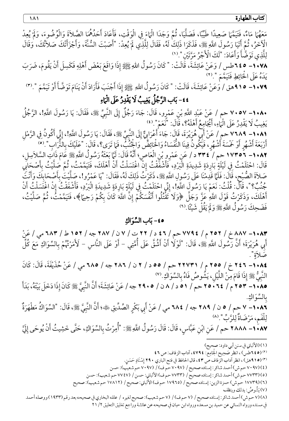 ١٠٨٦ - ٧ حم / ٥ ن / ٢٨٩ جه / ٦٨٤ مي / عَنْ أَبِي بَكْرٍ الصِّدِّيقِ - رضي الله عنه -؛ أَنَّ النَّبِيَّ - صلى الله عليه وسلم -، قَالَ: "السِّوَاكُ مَطْهَرَةٌ لِلْفَمِ، مَرْضَاةٌ لِلرَّبِّ". (¬٨)