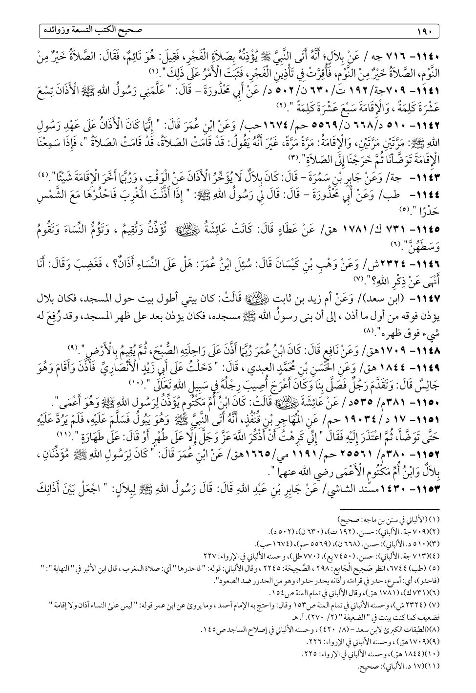 ١١٥٢ - ٣٨٠ م/ ٢٥٥٦١ حم/١١٩١ مي/١٦٦٥ هق/ عَنْ ابْنِ عُمَرَ قَالَ: " كَانَ لِرَسُولِ اللهِ - صلى الله عليه وسلم - مُؤَذِّنَانِ، بِلَالٌ وَابْنُ أُمِّ مَكْتُومٍ الْأَعْمَى رضي الله عنهما ".