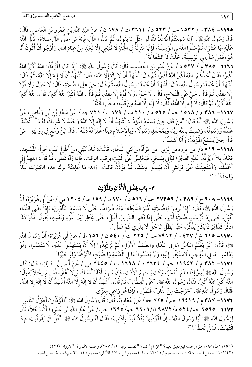 ١١٦٥ - ٣٨٤ م / ٦٥٣٢ حم / ٥٢٣ د / ٣٦١٤ ت / ٦٧٨ ن / عَنْ عَبْدِ اللَّهِ بْنِ عَمْرِو بْنِ الْعَاصِ، قَالَ: قَالَ رَسُولُ اللَّهِ - صلى الله عليه وسلم -: "إِذَا سَمِعْتُمْ الْمُؤَذِّنَ فَقُولُوا مِثْلَ مَا يَقُولُ، ثُمَّ صَلُّوا عَلَيَّ، فَإِنَّهُ مَنْ صَلَّى عَلَيَّ صَلَاةً، صَلَّى اللَّهُ عَلَيْهِ بِهَا عَشْرًا، ثُمَّ سَلُوا اللَّهَ لِي الْوَسِيلَةَ، فَإِنَّهَا مَنْزِلَةٌ فِي الْجَنَّةِ لَا تَنْبَغِي إِلَّا لِعَبْدٍ مِنْ عِبَادِ اللَّهِ، وَأَرْجُو أَنْ أَكُونَ أَنَا هُوَ، فَمَنْ سَأَلَ لِي الْوَسِيلَةَ، حَلَّتْ لَهُ الشَّفَاعَةُ".