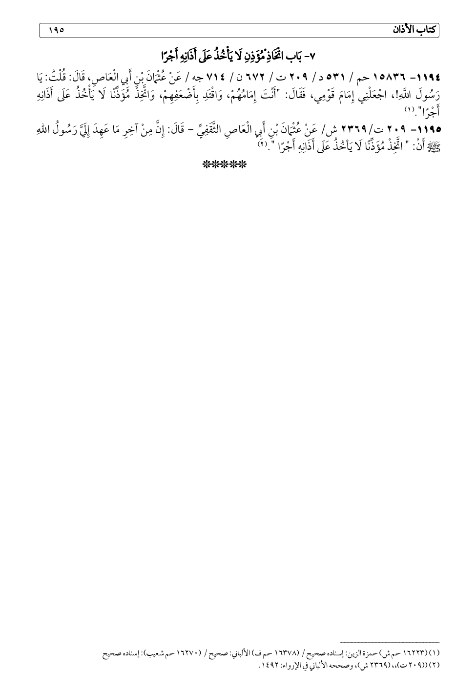 ١١٩٥ - ٢٠٩ ت/٢٣٦٩ ش/ عَنْ عُثْمَانَ بْنِ أَبِي الْعَاصِ الثَّقَفِيِّ - رضي الله عنه - قَالَ: إِنَّ مِنْ آخِرِ مَا عَهِدَ إِلَيَّ رَسُولُ اللهِ - صلى الله عليه وسلم - أَنْ: " اتَّخِذْ مُؤَذِّنًا لَا يَأخُذُ عَلَى أَذَانِهِ أَجْرًا ". (¬٢)
