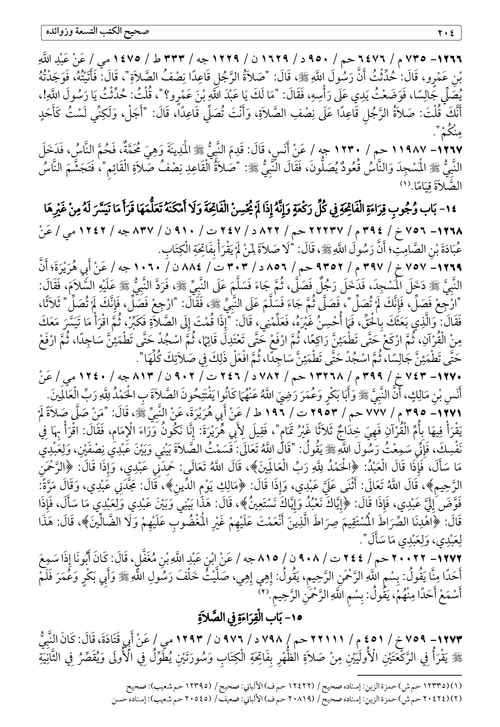 ١٢٦٩ - ٧٥٧ خ / ٣٩٧ م / ٩٣٥٢ حم / ٨٥٦ د / ٣٠٣ ت / ٨٨٤ ن / ١٠٦٠ جه / عَنْ أَبِي هُرَيْرَةَ؛ أَنَّ النَّبِيَّ - صلى الله عليه وسلم - دَخَلَ الْمَسْجِدَ، فَدَخَلَ رَجُلٌ فَصَلَّى، ثُمَّ جَاءَ فَسَلَّمَ عَلَى النَّبِيِّ - صلى الله عليه وسلم -، فَرَدَّ النَّبِيُّ - صلى الله عليه وسلم - عَلَيْهِ السَّلَامَ، فَقَالَ: "ارْجِعْ فَصَلِّ، فَإِنَّكَ لَمْ تُصَلِّ"، فَصَلَّى ثُمَّ جَاءَ فَسَلَّمَ عَلَى النَّبِيِّ - صلى الله عليه وسلم -، فَقَالَ: "ارْجِعْ فَصَلِّ، فَإِنَّكَ لَمْ تُصَلِّ" ثَلَاثًا، فَقَالَ: وَالَّذِي بَعَثَكَ بِالْحَقِّ، فَمَا أُحْسِنُ غَيْرَهُ، فَعَلِّمْنِي، قَالَ: "إِذَا قُمْتَ إِلَى الصَّلَاةِ فَكَبِّرْ، ثُمَّ اقْرَأْ مَا تَيَسَّرَ مَعَكَ مِنْ الْقُرْآنِ، ثُمَّ ارْكَعْ حَتَّى تَطْمَئِنَّ رَاكِعًا، ثُمَّ ارْفَعْ حَتَّى تَعْتَدِلَ قَائِمًا، ثُمَّ اسْجُدْ حَتَّى تَطْمَئِنَّ سَاجِدًا، ثُمَّ ارْفَعْ حَتَّى تَطْمَئِنَّ جَالِسًا، ثُمَّ اسْجُدْ حَتَّى تَطْمَئِنَّ سَاجِدًا، ثُمَّ افْعَلْ ذَلِكَ فِي صَلَاتِكَ كُلِّهَا".