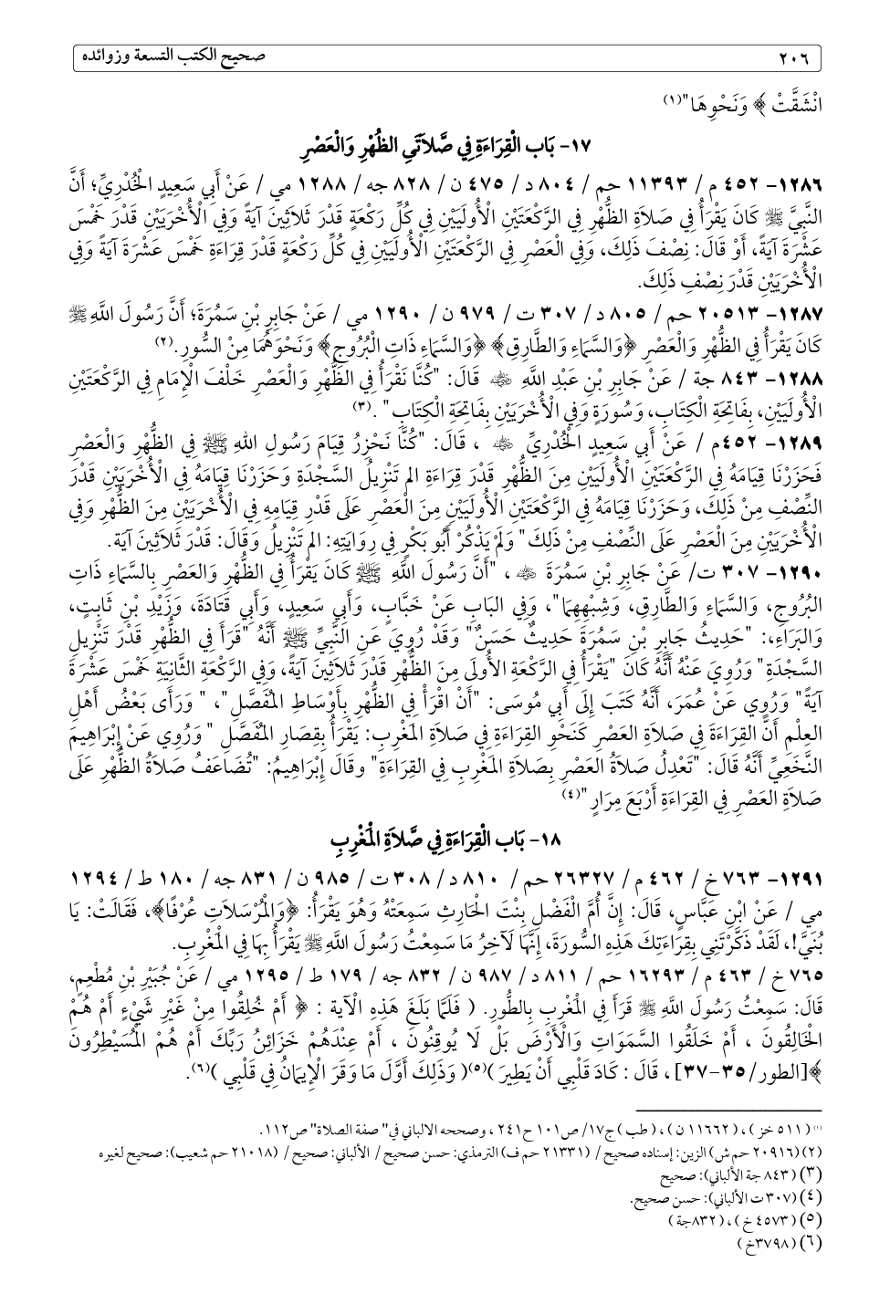 ١٢٩٠ - ٣٠٧ ت/ عَنْ جَابِرِ بْنِ سَمُرَةَ - رضي الله عنه -، "أَنَّ رَسُولَ اللَّهِ - صلى الله عليه وسلم - كَانَ يَقْرَأُ فِي الظُّهْرِ وَالعَصْرِ بِالسَّمَاءِ ذَاتِ البُرُوجِ، وَالسَّمَاءِ وَالطَّارِقِ، وَشِبْهِهِمَا"، وَفِي البَابِ عَنْ خَبَّابٍ، وَأَبِي سَعِيدٍ، وَأَبِي قَتَادَةَ، وَزَيْدِ بْنِ ثَابِتٍ، وَالبَرَاءِ،: "حَدِيثُ جَابِرِ بْنِ سَمُرَةَ حَدِيثٌ حَسَنٌ" وَقَدْ رُوِيَ عَنِ النَّبِيِّ - صلى الله عليه وسلم - أَنَّهُ "قَرَأَ فِي الظُّهْرِ قَدْرَ تَنْزِيلِ السَّجْدَةِ" وَرُوِيَ عَنْهُ أَنَّهُ كَانَ "يَقْرَأُ فِي الرَّكْعَةِ الأُولَى مِنَ الظُّهْرِ قَدْرَ ثَلَاثِينَ آيَةً، وَفِي الرَّكْعَةِ الثَّانِيَةِ خَمْسَ عَشْرَةَ آيَةً" وَرُوِي عَنْ عُمَرَ، أَنَّهُ كَتَبَ إِلَى أَبِي مُوسَى: "أَنْ اقْرَأْ فِي الظُّهْرِ بِأَوْسَاطِ المُفَصَّلِ"، " وَرَأَى بَعْضُ أَهْلِ العِلْمِ أَنَّ القِرَاءَةَ فِي صَلَاةِ العَصْرِ كَنَحْوِ القِرَاءَةِ فِي صَلَاةِ المَغْرِبِ: يَقْرَأُ بِقِصَارِ المُفَصَّلِ " وَرُوِي عَنْ إِبْرَاهِيمَ النَّخَعِيِّ أَنَّهُ قَالَ: "تَعْدِلُ صَلَاةُ العَصْرِ بِصَلَاةِ المَغْرِبِ فِي القِرَاءَةِ" وقَالَ إِبْرَاهِيمُ: "تُضَاعَفُ صَلَاةُ الظُّهْرِ عَلَى صَلَاةِ العَصْرِ فِي القِرَاءَةِ أَرْبَعَ مِرَارٍ" (¬٤)