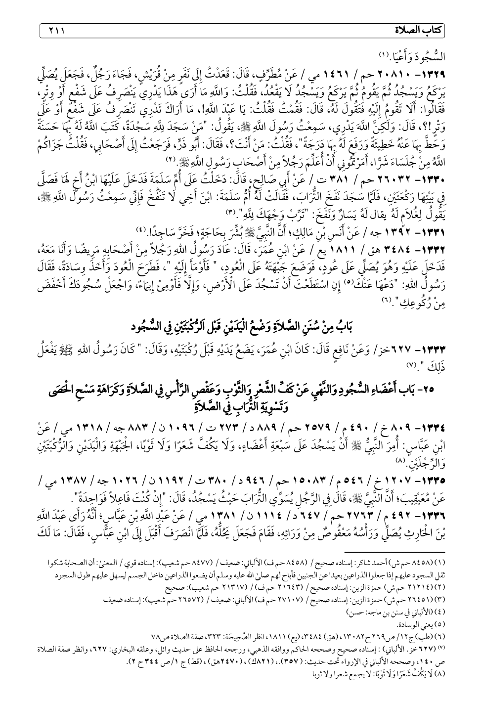 ١٣٣٤ - ٨٠٩ خ / ٤٩٠ م / ٢٥٧٩ حم / ٨٨٩ د / ٢٧٣ ت / ١٠٩٦ ن / ٨٨٣ جه / ١٣١٨ مي / عَنْ ابْنِ عَبَّاسٍ: أُمِرَ النَّبِيُّ - صلى الله عليه وسلم - أَنْ يَسْجُدَ عَلَى سَبْعَةِ أَعْضَاءٍ، وَلَا يَكُفَّ شَعَرًا وَلَا ثَوْبًا، الْجَبْهَةِ وَالْيَدَيْنِ وَالرُّكْبَتَيْنِ وَالرِّجْلَيْنِ. (¬٨)