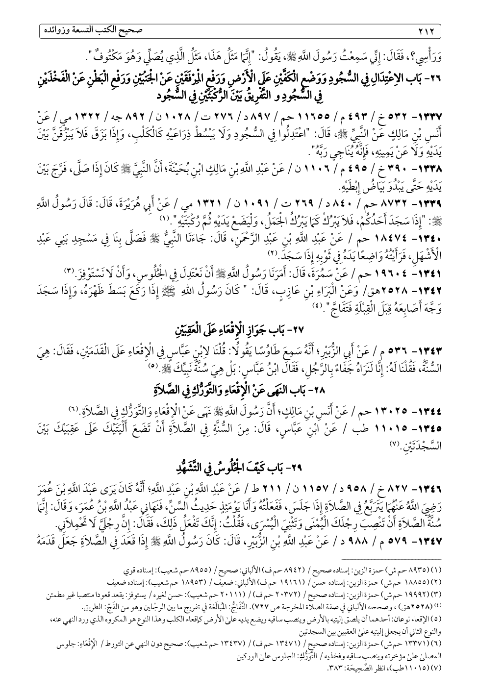 (¬٦) (١٣٣٧١ حم ش) حمزة الزين: إسناده صحيح / (١٣٤٧١ حم ف) / (١٣٤٣٧ حم شعيب): صحيح دون النهي عن التورط / الْإِقْعَاءِ: جلوس المصلى على مؤخرته وينصب ساقيه وفخذيه / التَّوَرُّكِ: الجلوس على الوركين