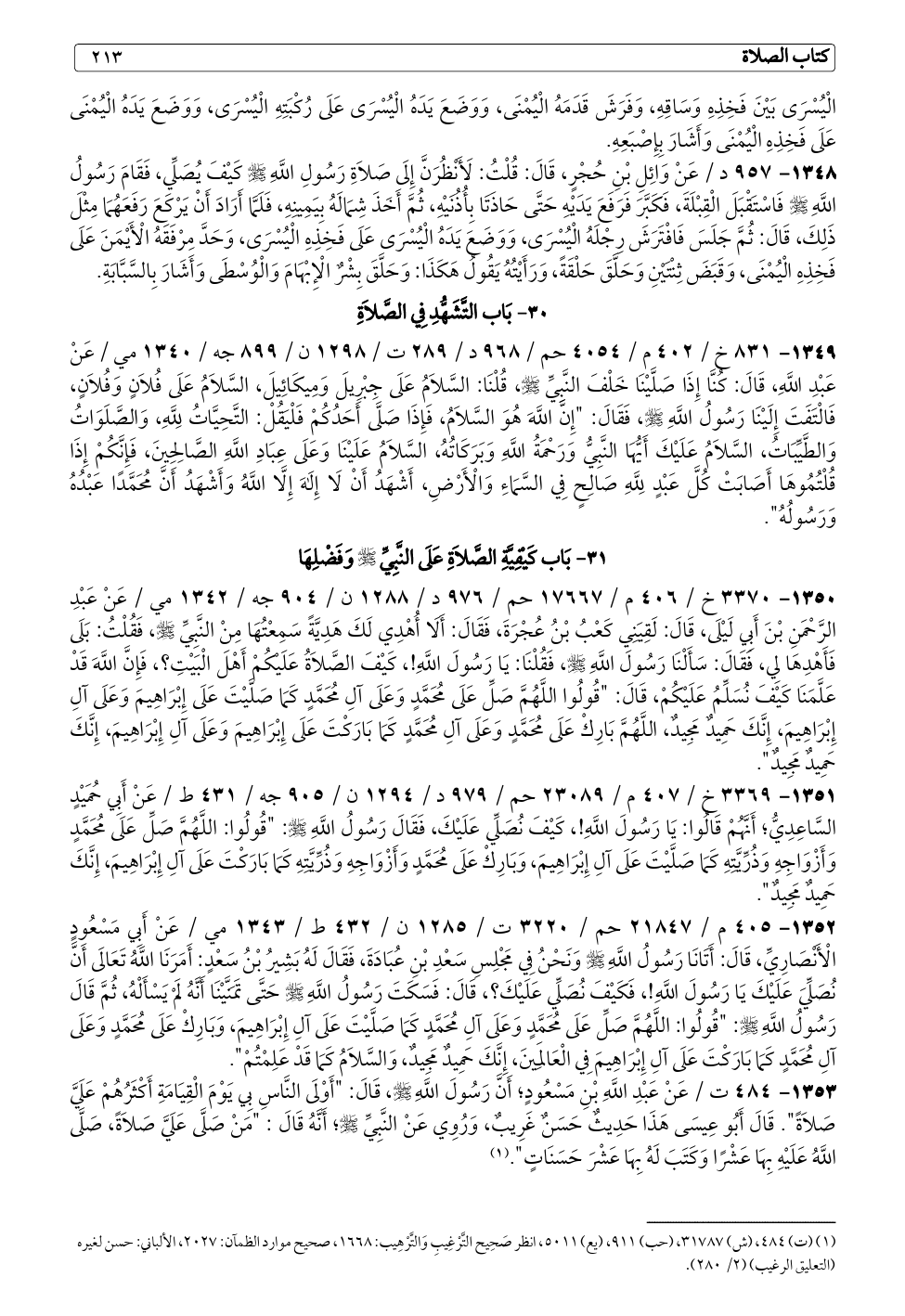 ١٣٤٨ - ٩٥٧ د / عَنْ وَائِلِ بْنِ حُجْرٍ، قَالَ: قُلْتُ: لَأَنْظُرَنَّ إِلَى صَلَاةِ رَسُولِ اللَّهِ - صلى الله عليه وسلم - كَيْفَ يُصَلِّي، فَقَامَ رَسُولُ اللَّهِ - صلى الله عليه وسلم - فَاسْتَقْبَلَ الْقِبْلَةَ، فَكَبَّرَ فَرَفَعَ يَدَيْهِ حَتَّى حَاذَتَا بِأُذُنَيْهِ، ثُمَّ أَخَذَ شِمَالَهُ بِيَمِينِهِ، فَلَمَّا أَرَادَ أَنْ يَرْكَعَ رَفَعَهُمَا مِثْلَ ذَلِكَ، قَالَ: ثُمَّ جَلَسَ فَافْتَرَشَ رِجْلَهُ الْيُسْرَى، وَوَضَعَ يَدَهُ الْيُسْرَى عَلَى فَخِذِهِ الْيُسْرَى، وَحَدَّ مِرْفَقَهُ الْأَيْمَنَ عَلَى فَخِذِهِ الْيُمْنَى، وَقَبَضَ ثِنْتَيْنِ وَحَلَّقَ حَلْقَةً، وَرَأَيْتُهُ يَقُولُ هَكَذَا: وَحَلَّقَ بِشْرٌ الْإِبْهَامَ وَالْوُسْطَى وَأَشَارَ بِالسَّبَّابَةِ.