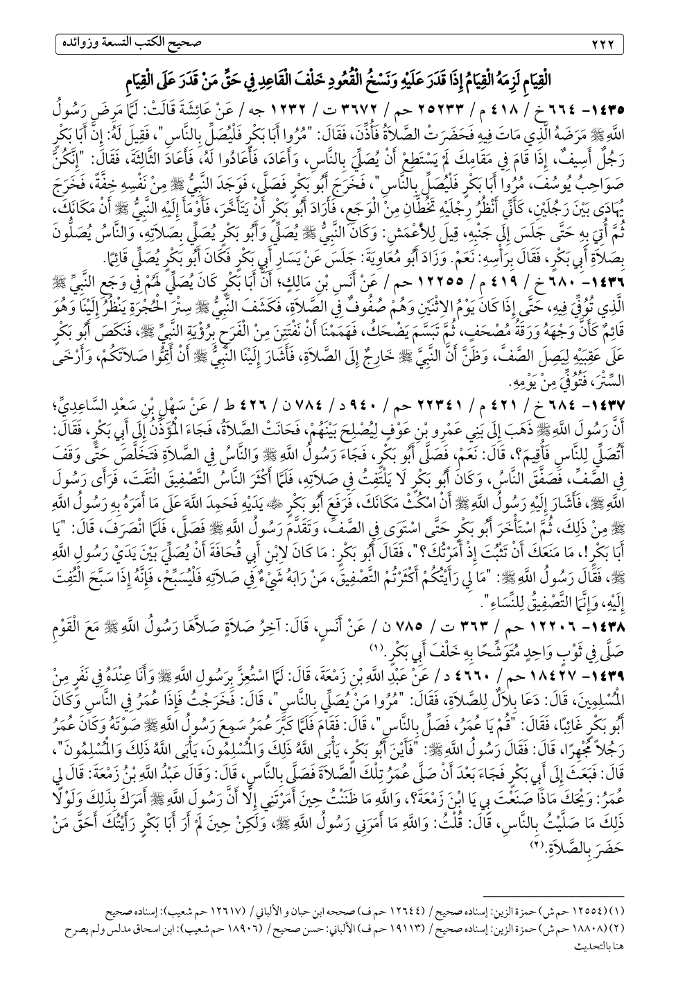 ١٤٣٧ - ٦٨٤ خ / ٤٢١ م / ٢٢٣٤١ حم / ٩٤٠ د / ٧٨٤ ن / ٤٢٦ ط / عَنْ سَهْلِ بْنِ سَعْدٍ السَّاعِدِيِّ؛ أَنَّ رَسُولَ اللَّهِ - صلى الله عليه وسلم - ذَهَبَ إِلَى بَنِي عَمْرِو بْنِ عَوْفٍ لِيُصْلِحَ بَيْنَهُمْ، فَحَانَتْ الصَّلَاةُ، فَجَاءَ الْمُؤَذِّنُ إِلَى أَبِي بَكْرٍ، فَقَالَ: أَتُصَلِّي لِلنَّاسِ فَأُقِيمَ؟، قَالَ: نَعَمْ، فَصَلَّى أَبُو بَكْرٍ، فَجَاءَ رَسُولُ اللَّهِ - صلى الله عليه وسلم - وَالنَّاسُ فِي الصَّلَاةِ فَتَخَلَّصَ حَتَّى وَقَفَ فِي الصَّفِّ، فَصَفَّقَ النَّاسُ، وَكَانَ أَبُو بَكْرٍ لَا يَلْتَفِتُ فِي صَلَاتِهِ، فَلَمَّا أَكْثَرَ النَّاسُ التَّصْفِيقَ الْتَفَتَ، فَرَأَى رَسُولَ اللَّهِ - صلى الله عليه وسلم -، فَأَشَارَ إِلَيْهِ رَسُولُ اللَّهِ - صلى الله عليه وسلم - أَنْ امْكُثْ مَكَانَكَ، فَرَفَعَ أَبُو بَكْرٍ - رضي الله عنه - يَدَيْهِ فَحَمِدَ اللَّهَ عَلَى مَا أَمَرَهُ بِهِ رَسُولُ اللَّهِ - صلى الله عليه وسلم - مِنْ ذَلِكَ، ثُمَّ اسْتَأْخَرَ أَبُو بَكْرٍ حَتَّى اسْتَوَى فِي الصَّفِّ، وَتَقَدَّمَ رَسُولُ اللَّهِ - صلى الله عليه وسلم - فَصَلَّى، فَلَمَّا انْصَرَفَ، قَالَ: "يَا أَبَا بَكْرٍ!، مَا مَنَعَكَ أَنْ تَثْبُتَ إِذْ أَمَرْتُكَ؟ "، فَقَالَ أَبُو بَكْرٍ: مَا كَانَ لِابْنِ أَبِي قُحَافَةَ أَنْ يُصَلِّيَ بَيْنَ يَدَيْ رَسُولِ اللَّهِ - صلى الله عليه وسلم -، فَقَالَ رَسُولُ اللَّهِ - صلى الله عليه وسلم -: "مَا لِي رَأَيْتُكُمْ أَكْثَرْتُمْ التَّصْفِيقَ، مَنْ رَابَهُ شَيْءٌ فِي صَلَاتِهِ فَلْيُسَبِّحْ، فَإِنَّهُ إِذَا سَبَّحَ الْتُفِتَ إِلَيْهِ، وَإِنَّمَا التَّصْفِيقُ لِلنِّسَاءِ".