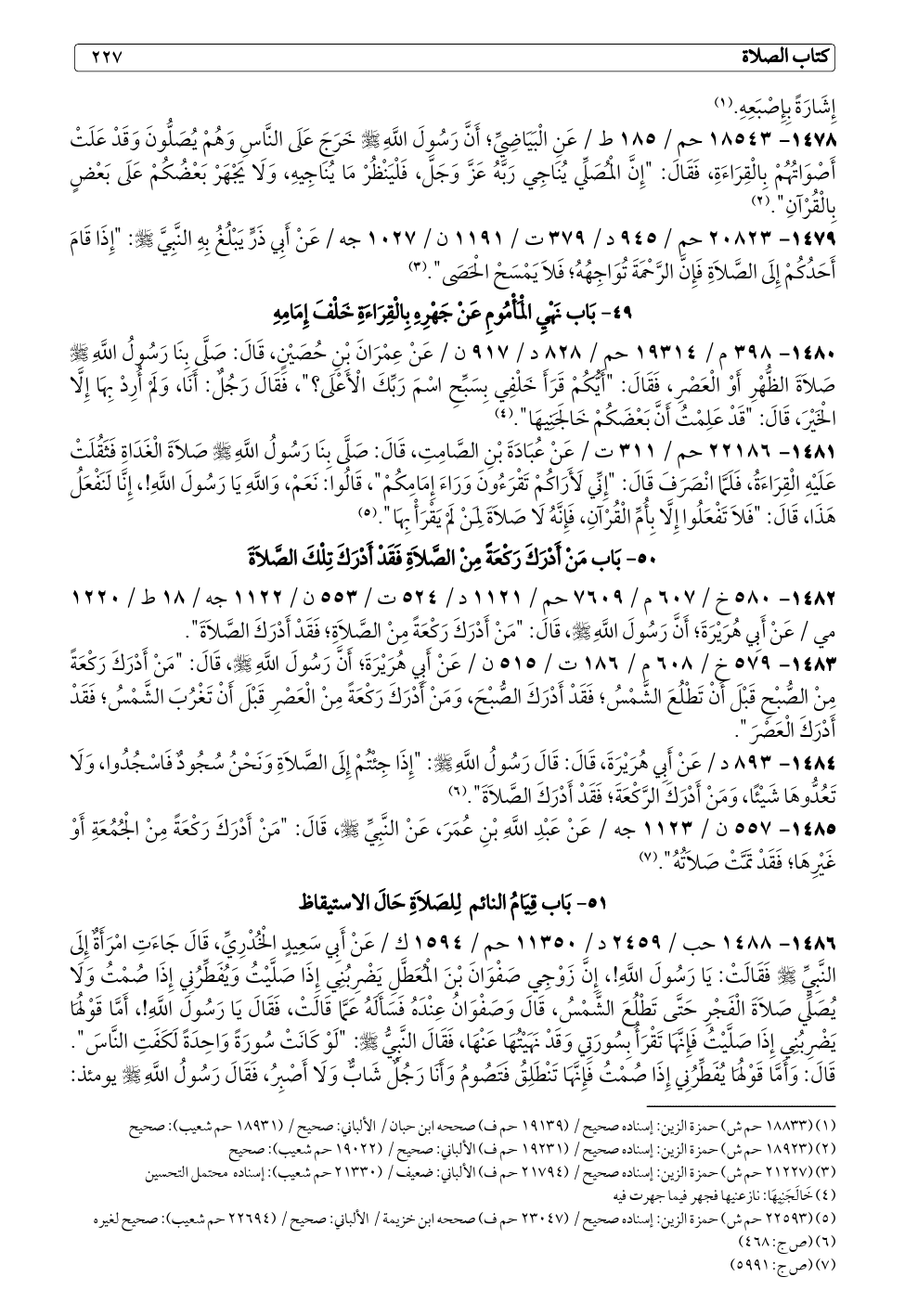 ١٤٨٣ - ٥٧٩ خ / ٦٠٨ م / ١٨٦ ت / ٥١٥ ن / عَنْ أَبِي هُرَيْرَةَ؛ أَنَّ رَسُولَ اللَّهِ - صلى الله عليه وسلم -، قَالَ: "مَنْ أَدْرَكَ رَكْعَةً مِنْ الصُّبْحِ قَبْلَ أَنْ تَطْلُعَ الشَّمْسُ؛ فَقَدْ أَدْرَكَ الصُّبْحَ، وَمَنْ أَدْرَكَ رَكْعَةً مِنْ الْعَصْرِ قَبْلَ أَنْ تَغْرُبَ الشَّمْسُ؛ فَقَدْ أَدْرَكَ الْعَصْرَ".