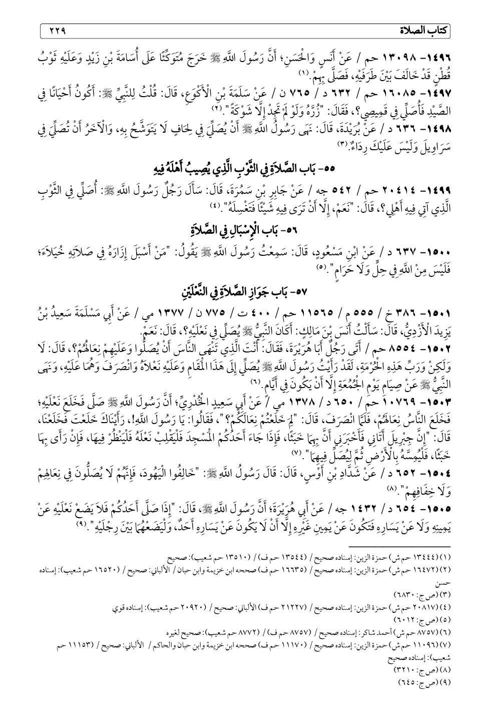 ١٥٠١ - ٣٨٦ خ / ٥٥٥ م / ١١٥٦٥ حم / ٤٠٠ ت / ٧٧٥ ن / ١٣٧٧ مي / عَنْ أَبِي مَسْلَمَةَ سَعِيدُ بْنُ يَزِيدَ الْأَزْدِيُّ، قَالَ: سَأَلْتُ أَنَسَ بْنَ مَالِكٍ: أَكَانَ النَّبِيُّ - صلى الله عليه وسلم - يُصَلِّي فِي نَعْلَيْهِ؟، قَالَ: نَعَمْ.
