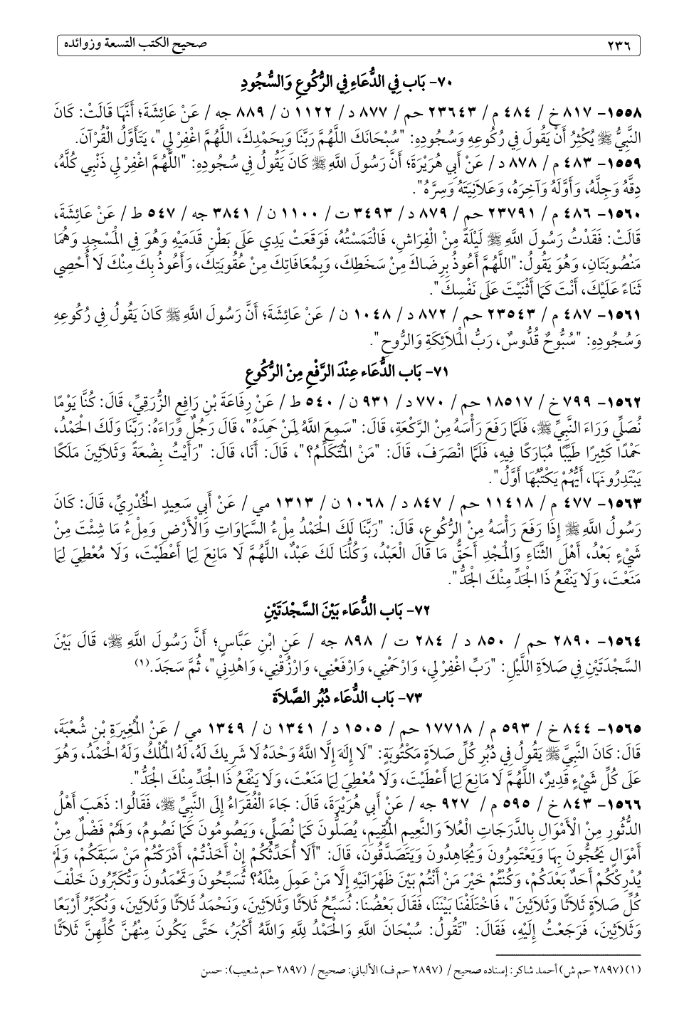 ١٥٦٣ - ٤٧٧ م / ١١٤١٨ حم / ٨٤٧ د / ١٠٦٨ ن / ١٣١٣ مي / عَنْ أَبِي سَعِيدٍ الْخُدْرِيِّ، قَالَ: كَانَ رَسُولُ اللَّهِ - صلى الله عليه وسلم - إِذَا رَفَعَ رَأْسَهُ مِنْ الرُّكُوعِ، قَالَ: "رَبَّنَا لَكَ الْحَمْدُ مِلْءُ السَّمَاوَاتِ وَالْأَرْضِ وَمِلْءُ مَا شِئْتَ مِنْ شَيْءٍ بَعْدُ، أَهْلَ الثَّنَاءِ وَالْمَجْدِ أَحَقُّ مَا قَالَ الْعَبْدُ، وَكُلُّنَا لَكَ عَبْدٌ، اللَّهُمَّ لَا مَانِعَ لِمَا أَعْطَيْتَ، وَلَا مُعْطِيَ لِمَا مَنَعْتَ، وَلَا يَنْفَعُ ذَا الْجَدِّ مِنْكَ الْجَدُّ".