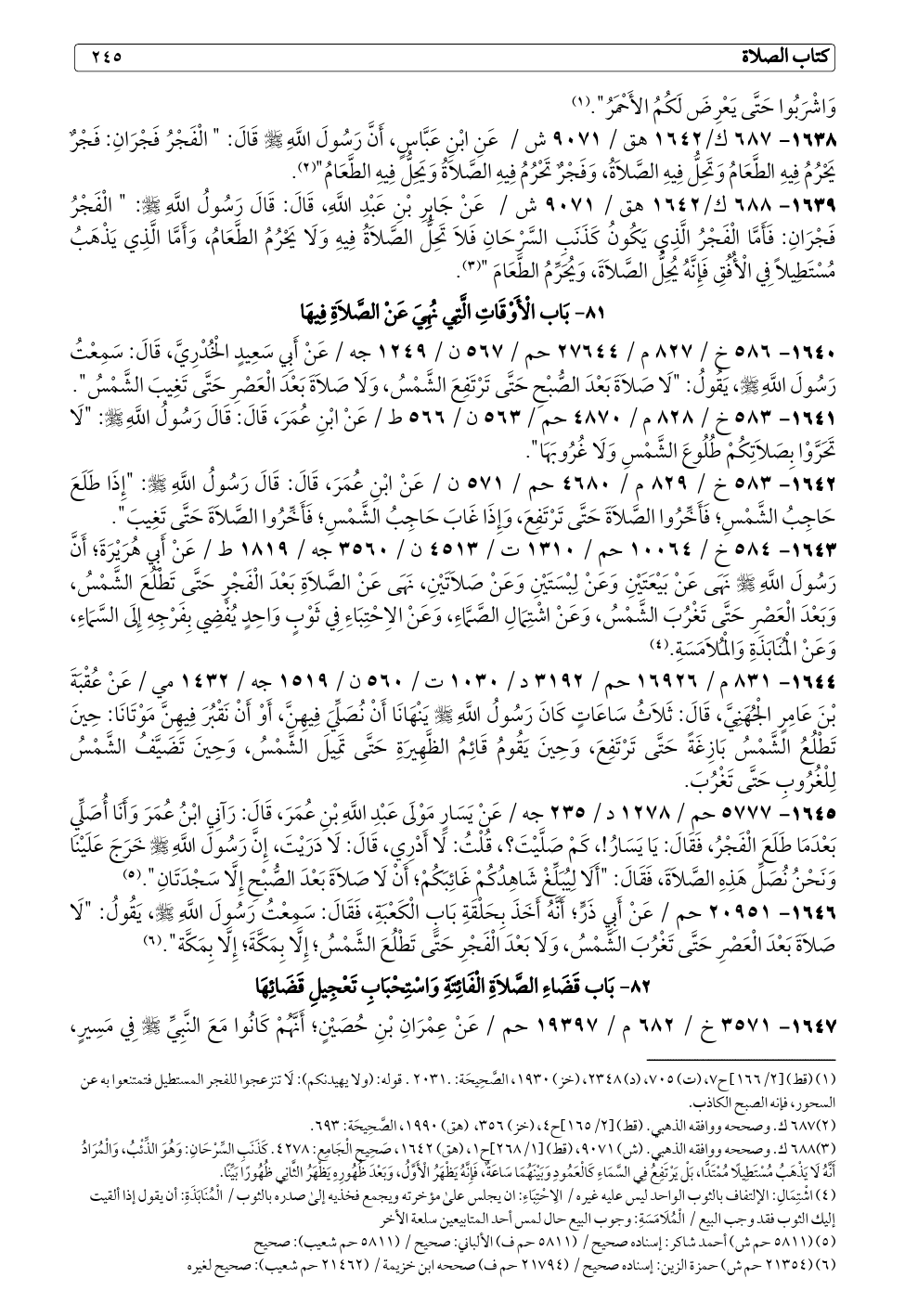 ١٦٤٠ - ٥٨٦ خ / ٨٢٧ م / ٢٧٦٤٤ حم / ٥٦٧ ن / ١٢٤٩ جه / عَنْ أَبِي سَعِيدٍ الْخُدْرِيَّ، قَالَ: سَمِعْتُ رَسُولَ اللَّهِ - صلى الله عليه وسلم -، يَقُولُ: "لَا صَلَاةَ بَعْدَ الصُّبْحِ حَتَّى تَرْتَفِعَ الشَّمْسُ، وَلَا صَلَاةَ بَعْدَ الْعَصْرِ حَتَّى تَغِيبَ الشَّمْسُ".