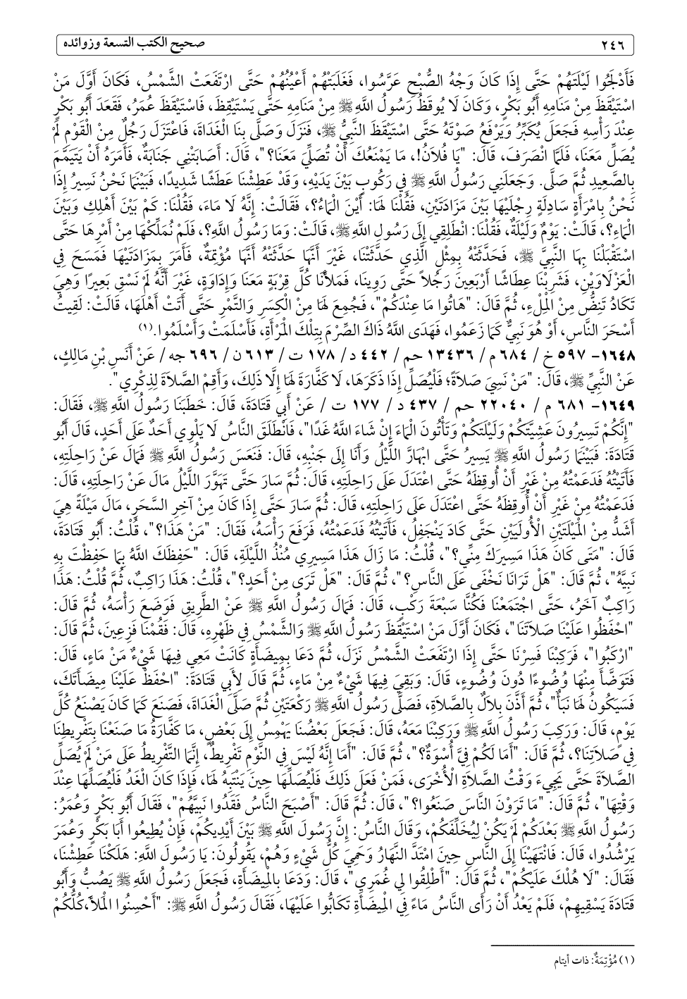 ١٦٤٩ - ٦٨١ م / ٢٢٠٤٠ حم / ٤٣٧ د / ١٧٧ ت / عَنْ أَبِي قَتَادَةَ، قَالَ: خَطَبَنَا رَسُولُ اللَّهِ - صلى الله عليه وسلم -، فَقَالَ: "إِنَّكُمْ تَسِيرُونَ عَشِيَّتَكُمْ وَلَيْلَتَكُمْ وَتَأْتُونَ الْمَاءَ إِنْ شَاءَ اللَّهُ غَدًا"، فَانْطَلَقَ النَّاسُ لَا يَلْوِي أَحَدٌ عَلَى أَحَدٍ، قَالَ أَبُو قَتَادَةَ: فَبَيْنَمَا رَسُولُ اللَّهِ - صلى الله عليه وسلم - يَسِيرُ حَتَّى ابْهَارَّ اللَّيْلُ وَأَنَا إِلَى جَنْبِهِ، قَالَ: فَنَعَسَ رَسُولُ اللَّهِ - صلى الله عليه وسلم - فَمَالَ عَنْ رَاحِلَتِهِ، فَأَتَيْتُهُ فَدَعَمْتُهُ مِنْ غَيْرِ أَنْ أُوقِظَهُ حَتَّى اعْتَدَلَ عَلَى رَاحِلَتِهِ، قَالَ: ثُمَّ سَارَ حَتَّى تَهَوَّرَ اللَّيْلُ مَالَ عَنْ رَاحِلَتِهِ، قَالَ: فَدَعَمْتُهُ مِنْ غَيْرِ أَنْ أُوقِظَهُ حَتَّى اعْتَدَلَ عَلَى رَاحِلَتِهِ، قَالَ: ثُمَّ سَارَ حَتَّى إِذَا كَانَ مِنْ آخِرِ السَّحَرِ، مَالَ مَيْلَةً هِيَ أَشَدُّ مِنْ الْمَيْلَتَيْنِ الْأُولَيَيْنِ حَتَّى كَادَ يَنْجَفِلُ، فَأَتَيْتُهُ فَدَعَمْتُهُ، فَرَفَعَ رَأْسَهُ، فَقَالَ: "مَنْ هَذَا؟ "، قُلْتُ: أَبُو قَتَادَةَ، قَالَ: "مَتَى كَانَ هَذَا مَسِيرَكَ مِنِّي؟ "، قُلْتُ: مَا زَالَ هَذَا مَسِيرِي مُنْذُ اللَّيْلَةِ، قَالَ: "حَفِظَكَ اللَّهُ بِمَا حَفِظْتَ بِهِ نَبِيَّهُ"، ثُمَّ قَالَ: "هَلْ تَرَانَا نَخْفَى عَلَى النَّاسِ؟ "، ثُمَّ قَالَ: "هَلْ تَرَى مِنْ أَحَدٍ؟ "، قُلْتُ: هَذَا رَاكِبٌ، ثُمَّ قُلْتُ: هَذَا رَاكِبٌ آخَرُ، حَتَّى اجْتَمَعْنَا فَكُنَّا سَبْعَةَ رَكْبٍ، قَالَ: فَمَالَ رَسُولُ اللَّهِ - صلى الله عليه وسلم - عَنْ الطَّرِيقِ فَوَضَعَ رَأْسَهُ، ثُمَّ قَالَ: "احْفَظُوا عَلَيْنَا صَلَاتَنَا"، فَكَانَ أَوَّلَ مَنْ اسْتَيْقَظَ رَسُولُ اللَّهِ - صلى الله عليه وسلم - وَالشَّمْسُ فِي ظَهْرِهِ، قَالَ: فَقُمْنَا فَزِعِينَ،