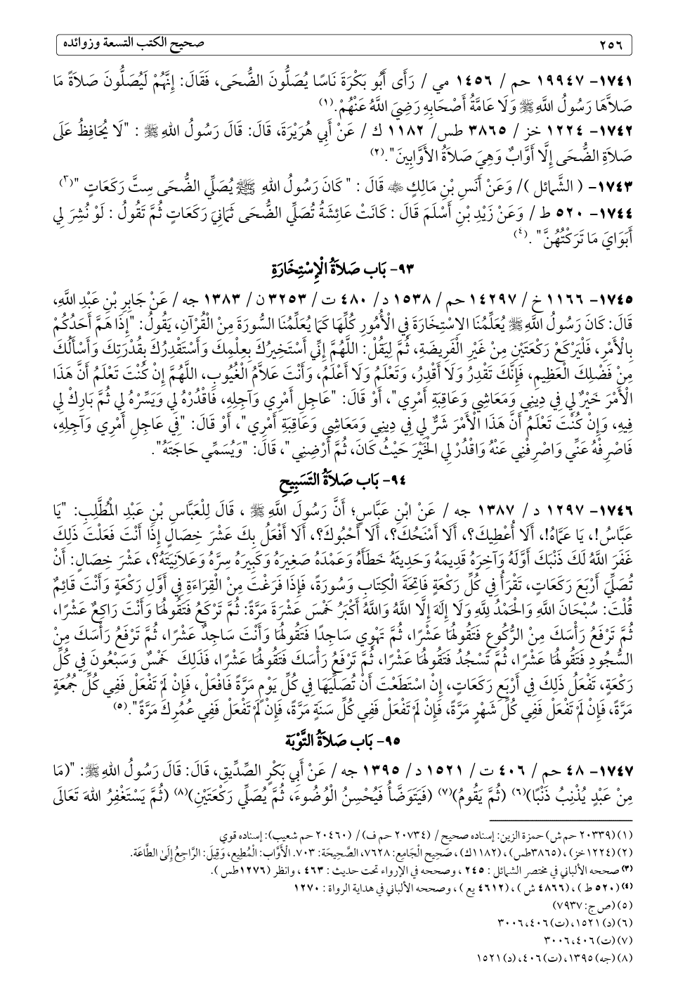 ١٧٤٦ - ١٢٩٧ د / ١٣٨٧ جه / عَنْ ابْنِ عَبَّاسٍ؛ أَنَّ رَسُولَ اللَّهِ - صلى الله عليه وسلم -، قَالَ لِلْعَبَّاسِ بْنِ عَبْدِ الْمُطَّلِبِ: "يَا عَبَّاسُ!، يَا عَمَّاهُ!، أَلَا أُعْطِيكَ؟، أَلَا أَمْنَحُكَ؟، أَلَا أَحْبُوكَ؟، أَلَا أَفْعَلُ بِكَ عَشْرَ خِصَالٍ إِذَا أَنْتَ فَعَلْتَ ذَلِكَ غَفَرَ اللَّهُ لَكَ ذَنْبَكَ أَوَّلَهُ وَآخِرَهُ قَدِيمَهُ وَحَدِيثَهُ خَطَأَهُ وَعَمْدَهُ صَغِيرَهُ وَكَبِيرَهُ سِرَّهُ وَعَلَانِيَتَهُ؟، عَشْرَ خِصَالٍ: أَنْ تُصَلِّيَ أَرْبَعَ رَكَعَاتٍ، تَقْرَأُ فِي كُلِّ رَكْعَةٍ فَاتِحَةَ الْكِتَابِ وَسُورَةً، فَإِذَا فَرَغْتَ مِنْ الْقِرَاءَةِ فِي أَوَّلِ رَكْعَةٍ وَأَنْتَ قَائِمٌ قُلْتَ: سُبْحَانَ اللَّهِ وَالْحَمْدُ لِلَّهِ وَلَا إِلَهَ إِلَّا اللَّهُ وَاللَّهُ أَكْبَرُ خَمْسَ عَشْرَةَ مَرَّةً: ثُمَّ تَرْكَعُ فَتَقُولُهَا وَأَنْتَ رَاكِعٌ عَشْرًا، ثُمَّ تَرْفَعُ رَأْسَكَ مِنْ الرُّكُوعِ فَتَقُولُهَا عَشْرًا، ثُمَّ تَهْوِي سَاجِدًا فَتَقُولُهَا وَأَنْتَ سَاجِدٌ عَشْرًا، ثُمَّ تَرْفَعُ رَأْسَكَ مِنْ السُّجُودِ فَتَقُولُهَا عَشْرًا، ثُمَّ تَسْجُدُ فَتَقُولُهَا عَشْرًا، ثُمَّ تَرْفَعُ رَأْسَكَ فَتَقُولُهَا عَشْرًا، فَذَلِكَ خَمْسٌ وَسَبْعُونَ فِي كُلِّ رَكْعَةٍ، تَفْعَلُ ذَلِكَ فِي أَرْبَعِ رَكَعَاتٍ، إِنْ اسْتَطَعْتَ أَنْ تُصَلِّيَهَا فِي كُلِّ يَوْمٍ مَرَّةً فَافْعَلْ، فَإِنْ لَمْ تَفْعَلْ فَفِي كُلِّ جُمُعَةٍ مَرَّةً، فَإِنْ لَمْ تَفْعَلْ فَفِي كُلِّ شَهْرٍ مَرَّةً، فَإِنْ لَمْ تَفْعَلْ فَفِي كُلِّ سَنَةٍ مَرَّةً، فَإِنْ لَمْ تَفْعَلْ فَفِي عُمُرِكَ مَرَّةً". (¬٥)