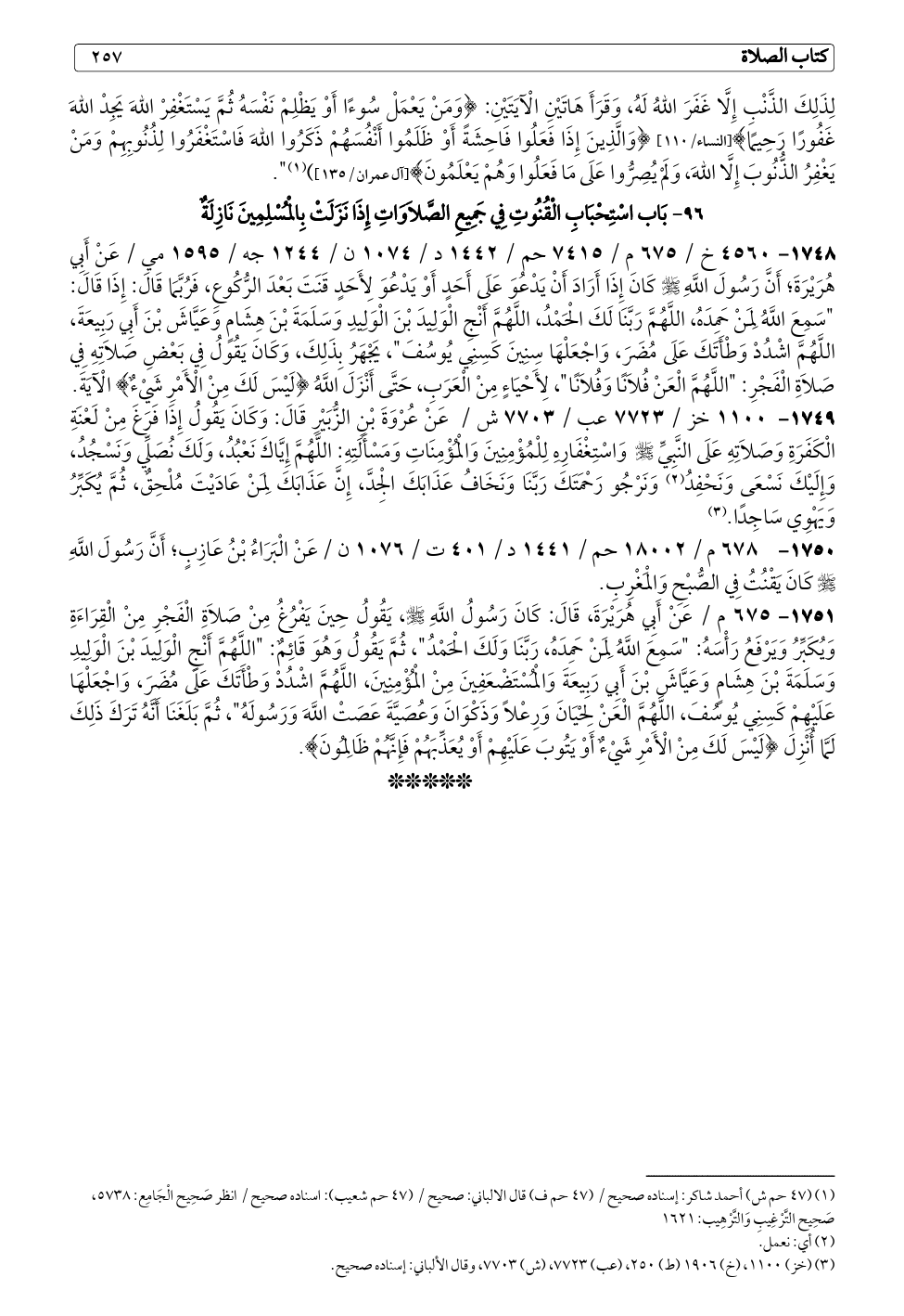 ١٧٥١ - ٦٧٥ م / عَنْ أَبِي هُرَيْرَةَ، قَالَ: كَانَ رَسُولُ اللَّهِ - صلى الله عليه وسلم -، يَقُولُ حِينَ يَفْرُغُ مِنْ صَلَاةِ الْفَجْرِ مِنْ الْقِرَاءَةِ وَيُكَبِّرُ وَيَرْفَعُ رَأْسَهُ: "سَمِعَ اللَّهُ لِمَنْ حَمِدَهُ، رَبَّنَا وَلَكَ الْحَمْدُ"، ثُمَّ يَقُولُ وَهُوَ قَائِمٌ: "اللَّهُمَّ أَنْجِ الْوَلِيدَ بْنَ الْوَلِيدِ وَسَلَمَةَ بْنَ هِشَامٍ وَعَيَّاشَ بْنَ أَبِي رَبِيعَةَ وَالْمُسْتَضْعَفِينَ مِنْ الْمُؤْمِنِينَ، اللَّهُمَّ اشْدُدْ وَطْأَتَكَ عَلَى مُضَرَ، وَاجْعَلْهَا عَلَيْهِمْ كَسِنِي يُوسُفَ، اللَّهُمَّ الْعَنْ لِحْيَانَ وَرِعْلًا وَذَكْوَانَ وَعُصَيَّةَ عَصَتْ اللَّهَ وَرَسُولَهُ"، ثُمَّ بَلَغَنَا أَنَّهُ تَرَكَ ذَلِكَ لَمَّا أُنْزِلَ {لَيْسَ لَكَ مِنْ الْأَمْرِ شَيْءٌ أَوْ يَتُوبَ عَلَيْهِمْ أَوْ يُعَذِّبَهُمْ فَإِنَّهُمْ ظَالِمُونَ}.