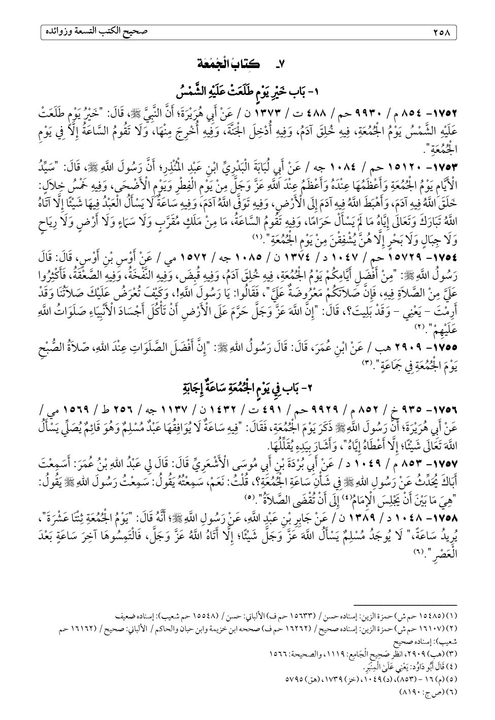 ١٧٥٨ - ١٠٤٨ د / ١٣٨٩ ن / عَنْ جَابِرِ بْنِ عَبْدِ اللَّهِ، عَنْ رَسُولِ اللَّهِ - صلى الله عليه وسلم -؛ أَنَّهُ قَالَ: "يَوْمُ الْجُمُعَةِ ثِنْتَا عَشْرَةَ"، يُرِيدُ سَاعَةً،" لَا يُوجَدُ مُسْلِمٌ يَسْأَلُ اللَّهَ عَزَّ وَجَلَّ شَيْئًا؛ إِلَّا أَتَاهُ اللَّهُ عَزَّ وَجَلَّ، فَالْتَمِسُوهَا آخِرَ سَاعَةٍ بَعْدَ الْعَصْرِ". (¬٦)