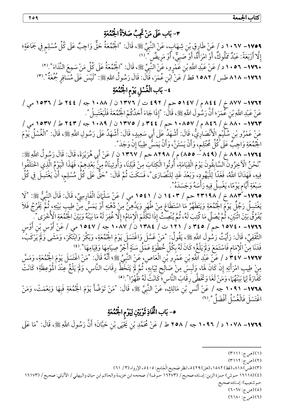 ١٧٦٤ - ٨٩٨ خ / (٨٤٩ - ٨٥٥) م / ٨٢٩٨ حم / ١٣٦٧ ن / عَنْ أَبِي هُرَيْرَةَ، قَالَ: قَالَ رَسُولُ اللَّهِ - صلى الله عليه وسلم -: "نَحْنُ الْآخِرُونَ السَّابِقُونَ يَوْمَ الْقِيَامَةِ، أُوتُوا الْكِتَابَ مِنْ قَبْلِنَا، وَأُوتِينَاهُ مِنْ بَعْدِهِمْ، فَهَذَا الْيَوْمُ الَّذِي اخْتَلَفُوا فِيهِ، فَهَدَانَا اللَّهُ، فَغَدًا لِلْيَهُودِ، وَبَعْدَ غَدٍ لِلنَّصَارَى"، فَسَكَتَ ثُمَّ قَالَ: "حَقٌّ عَلَى كُلِّ مُسْلِمٍ، أَنْ يَغْتَسِلَ فِي كُلِّ سَبْعَةِ أَيَّامٍ يَوْمًا، يَغْسِلُ فِيهِ رَأْسَهُ وَجَسَدَهُ".