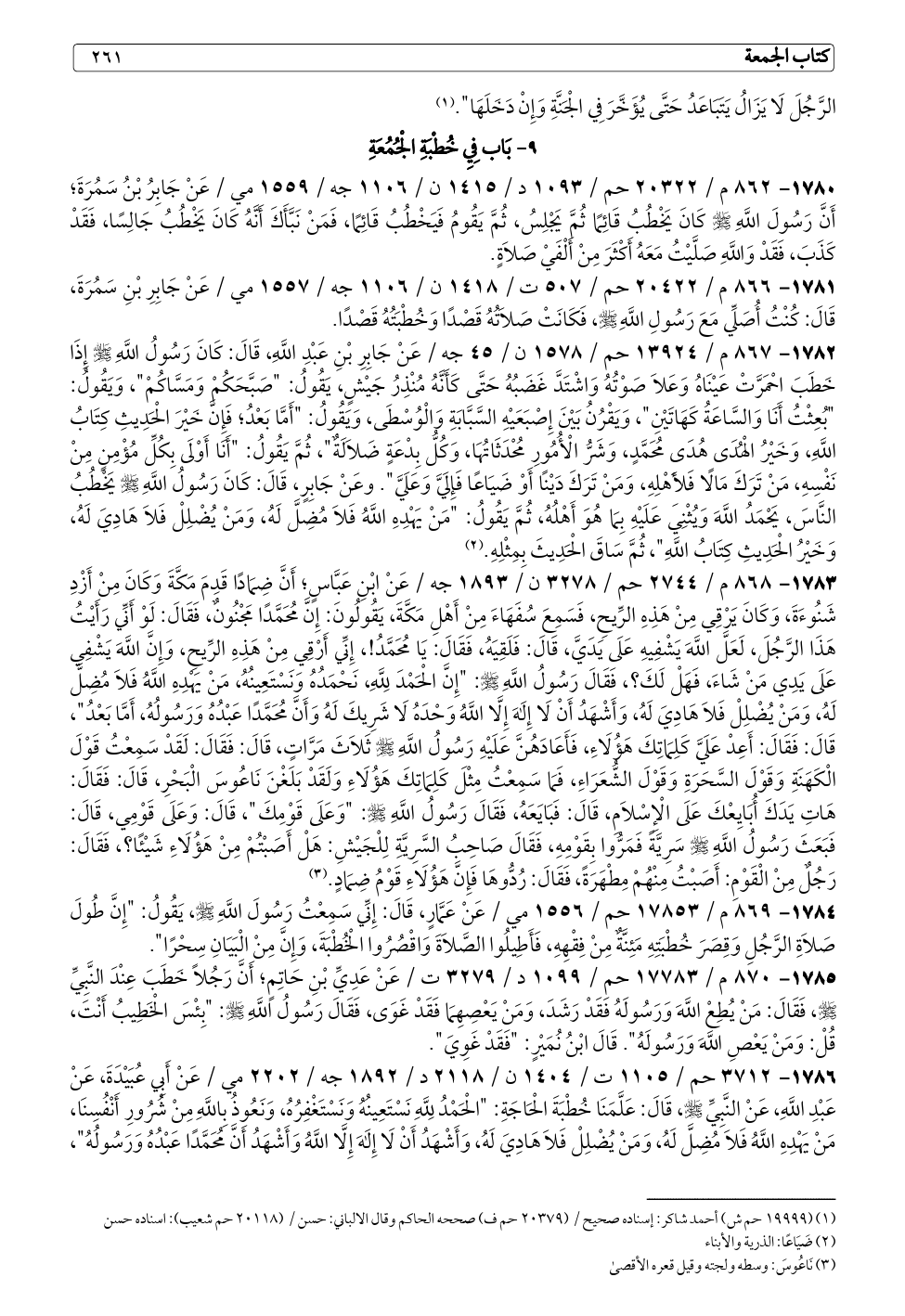 ١٧٨٢ - ٨٦٧ م / ١٣٩٢٤ حم / ١٥٧٨ ن / ٤٥ جه / عَنْ جَابِرِ بْنِ عَبْدِ اللَّهِ، قَالَ: كَانَ رَسُولُ اللَّهِ - صلى الله عليه وسلم - إِذَا خَطَبَ احْمَرَّتْ عَيْنَاهُ وَعَلَا صَوْتُهُ وَاشْتَدَّ غَضَبُهُ حَتَّى كَأَنَّهُ مُنْذِرُ جَيْشٍ، يَقُولُ: "صَبَّحَكُمْ وَمَسَّاكُمْ"، وَيَقُولُ: "بُعِثْتُ أَنَا وَالسَّاعَةُ كَهَاتَيْنِ"، وَيَقْرُنُ بَيْنَ إِصْبَعَيْهِ السَّبَّابَةِ وَالْوُسْطَى، وَيَقُولُ: "أَمَّا بَعْدُ؛ فَإِنَّ خَيْرَ الْحَدِيثِ كِتَابُ اللَّهِ، وَخَيْرُ الْهُدَى هُدَى مُحَمَّدٍ، وَشَرُّ الْأُمُورِ مُحْدَثَاتُهَا، وَكُلُّ بِدْعَةٍ ضَلَالَةٌ"، ثُمَّ يَقُولُ: "أَنَا أَوْلَى بِكُلِّ مُؤْمِنٍ مِنْ نَفْسِهِ، مَنْ تَرَكَ مَالًا فَلِأَهْلِهِ، وَمَنْ تَرَكَ دَيْنًا أَوْ ضَيَاعًا فَإِلَيَّ وَعَلَيَّ". وعَنْ جَابِرٍ، قَالَ: كَانَ رَسُولُ اللَّهِ - صلى الله عليه وسلم - يَخْطُبُ النَّاسَ، يَحْمَدُ اللَّهَ وَيُثْنِي عَلَيْهِ بِمَا هُوَ أَهْلُهُ، ثُمَّ يَقُولُ: "مَنْ يَهْدِهِ اللَّهُ فَلَا مُضِلَّ لَهُ، وَمَنْ يُضْلِلْ فَلَا هَادِيَ لَهُ، وَخَيْرُ الْحَدِيثِ كِتَابُ اللَّهِ"، ثُمَّ سَاقَ الْحَدِيثَ بِمِثْلِهِ. (¬٢)