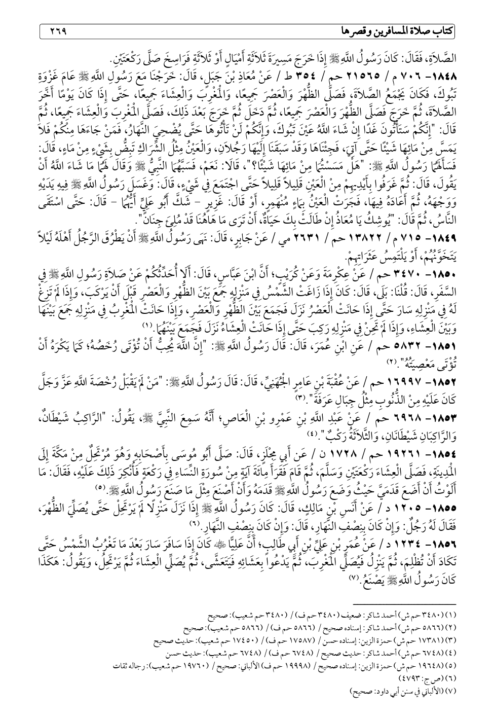 ١٨٤٨ - ٧٠٦ م / ٢١٥٦٥ حم / ٣٥٤ ط / عَنْ مُعَاذِ بْنَ جَبَلٍ، قَالَ: خَرَجْنَا مَعَ رَسُولِ اللَّهِ - صلى الله عليه وسلم - عَامَ غَزْوَةِ تَبُوكَ، فَكَانَ يَجْمَعُ الصَّلَاةَ، فَصَلَّى الظُّهْرَ وَالْعَصْرَ جَمِيعًا، وَالْمَغْرِبَ وَالْعِشَاءَ جَمِيعًا، حَتَّى إِذَا كَانَ يَوْمًا أَخَّرَ الصَّلَاةَ، ثُمَّ خَرَجَ فَصَلَّى الظُّهْرَ وَالْعَصْرَ جَمِيعًا، ثُمَّ دَخَلَ ثُمَّ خَرَجَ بَعْدَ ذَلِكَ، فَصَلَّى الْمَغْرِبَ وَالْعِشَاءَ جَمِيعًا، ثُمَّ قَالَ: "إِنَّكُمْ سَتَأْتُونَ غَدًا إِنْ شَاءَ اللَّهُ عَيْنَ تَبُوكَ، وَإِنَّكُمْ لَنْ تَأْتُوهَا حَتَّى يُضْحِيَ النَّهَارُ، فَمَنْ جَاءَهَا مِنْكُمْ فَلَا يَمَسَّ مِنْ مَائِهَا شَيْئًا حَتَّى آتِيَ، فَجِئْنَاهَا وَقَدْ سَبَقَنَا إِلَيْهَا رَجُلَانِ، وَالْعَيْنُ مِثْلُ الشِّرَاكِ تَبِضُّ بِشَيْءٍ مِنْ مَاءٍ، قَالَ: فَسَأَلَهُمَا رَسُولُ اللَّهِ - صلى الله عليه وسلم -: "هَلْ مَسَسْتُمَا مِنْ مَائِهَا شَيْئًا؟ "، قَالَا: نَعَمْ، فَسَبَّهُمَا النَّبِيُّ - صلى الله عليه وسلم - وَقَالَ لَهُمَا مَا شَاءَ اللَّهُ أَنْ يَقُولَ، قَالَ: ثُمَّ غَرَفُوا بِأَيْدِيهِمْ مِنْ الْعَيْنِ قَلِيلًا قَلِيلًا حَتَّى اجْتَمَعَ فِي شَيْءٍ، قَالَ: وَغَسَلَ رَسُولُ اللَّهِ - صلى الله عليه وسلم - فِيهِ يَدَيْهِ وَوَجْهَهُ، ثُمَّ أَعَادَهُ فِيهَا، فَجَرَتْ الْعَيْنُ بِمَاءٍ مُنْهَمِرٍ، أَوْ قَالَ: غَزِيرٍ - شَكَّ أَبُو عَلِيٍّ أَيُّهُمَا - قَالَ: حَتَّى اسْتَقَى النَّاسُ، ثُمَّ قَالَ: "يُوشِكُ يَا مُعَاذُ إِنْ طَالَتْ بِكَ حَيَاةٌ، أَنْ تَرَى مَا هَاهُنَا قَدْ مُلِئَ جِنَانً".