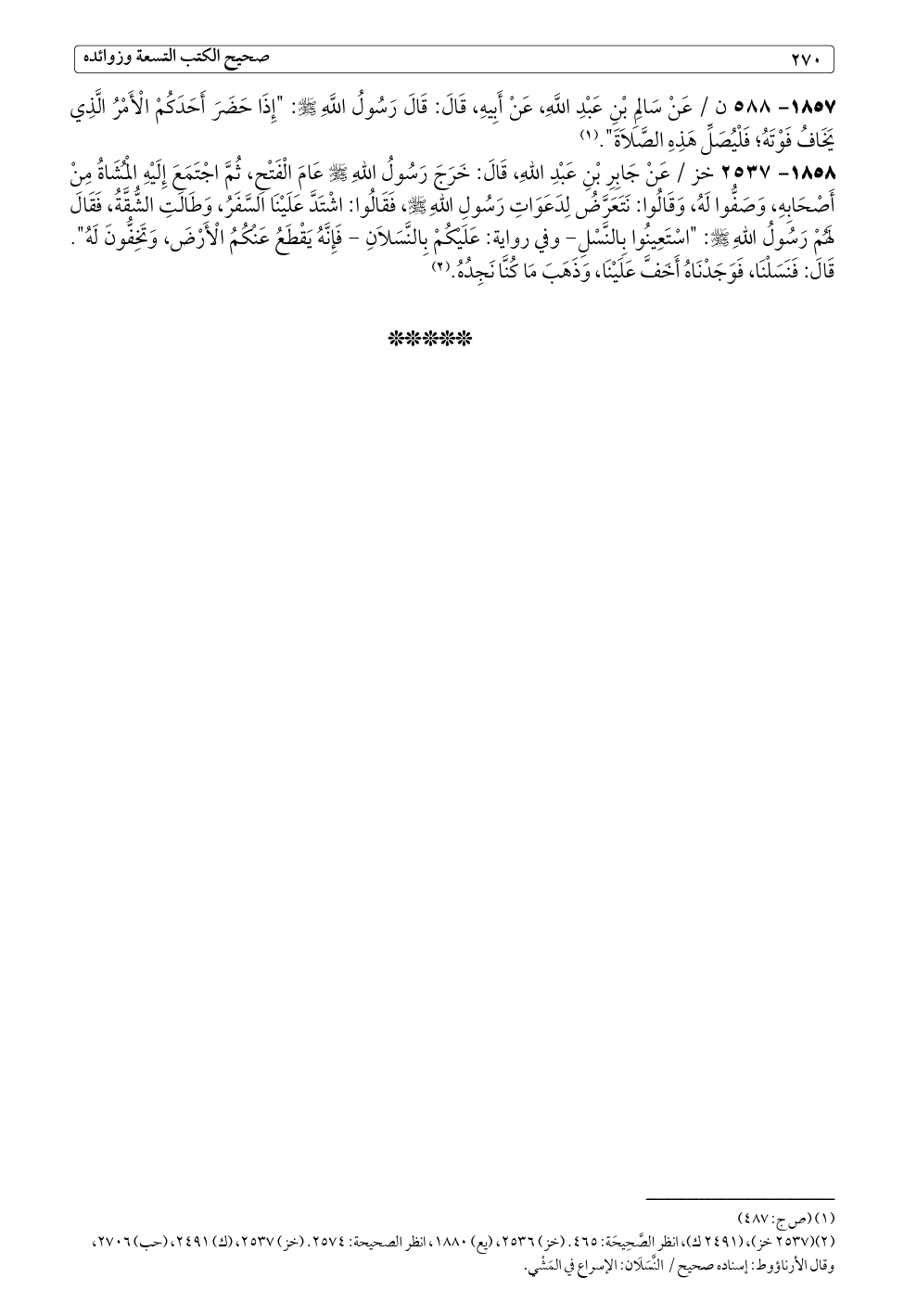 ١٨٥٨ - ٢٥٣٧ خز / عَنْ جَابِرِ بْنِ عَبْدِ اللهِ، قَالَ: خَرَجَ رَسُولُ اللهِ - صلى الله عليه وسلم - عَامَ الْفَتْحِ، ثُمَّ اجْتَمَعَ إِلَيْهِ الْمُشَاةُ مِنْ أَصْحَابِهِ، وَصَفُّوا لَهُ، وَقَالُوا: نَتَعَرَّضُ لِدَعَوَاتِ رَسُولِ اللهِ - صلى الله عليه وسلم -، فَقَالُوا: اشْتَدَّ عَلَيْنَا السَّفَرُ، وَطَالَتِ الشُّقَّةُ، فَقَالَ لَهُمْ رَسُولُ اللهِ - صلى الله عليه وسلم -: "اسْتَعِينُوا بِالنَّسْلِ- وفي رواية: عَلَيْكُمْ بِالنَّسَلَانِ - فَإِنَّهُ يَقْطَعُ عَنْكُمُ الْأَرْضَ، وَتَخِفُّونَ لَهُ". قَالَ: فَنَسَلْنَا، فَوَجَدْنَاهُ أَخَفَّ عَلَيْنَا، وَذَهَبَ مَا كُنَّا نَجِدُهُ. (¬٢)