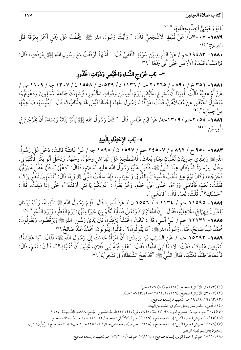 ١٨٨٢ - ٢٠٥٤ حم /١٣٠٩ جة/ عَنْ ابْنِ عَبَّاسٍ قَالَ: " كَانَ رَسُولُ اللهِ - صلى الله عليه وسلم - يَأْمُرُ بَنَاتَهُ وَنِسَاءَهُ أَنْ يَخْرُجْنَ فِي الْعِيدَيْنِ ". (¬٥)