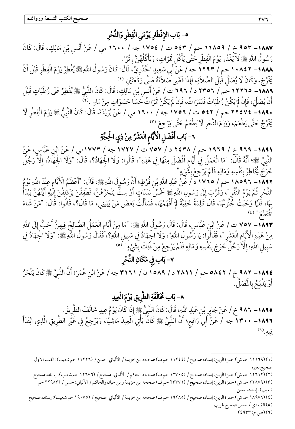 ١٨٩٠ - ٢٢٤٧٤ حم / ٥٤٢ ت / ١٧٥٦ جه / ١٦٠٠ مي / عَنْ بُرَيْدَةَ، قَالَ: كَانَ النَّبِيُّ - صلى الله عليه وسلم - يَوْمَ الْفِطْرِ لَا يَخْرُجُ حَتَّى يَطْعَمَ، وَيَوْمَ النَّحْرِ لَا يَطْعَمُ حَتَّى يَرْجِعَ. (¬٣)