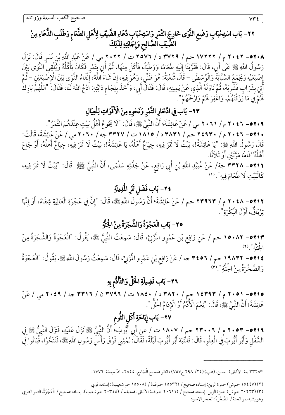 ٥٢٠٩ - ٢٠٤٦ م / ٢٠٦١ مي / عَنْ عَائِشَةَ؛ أَنَّ النَّبِيَّ - صلى الله عليه وسلم -، قَالَ: "لَا يَجُوعُ أَهْلُ بَيْتٍ عِنْدَهُمْ التَّمْرُ".