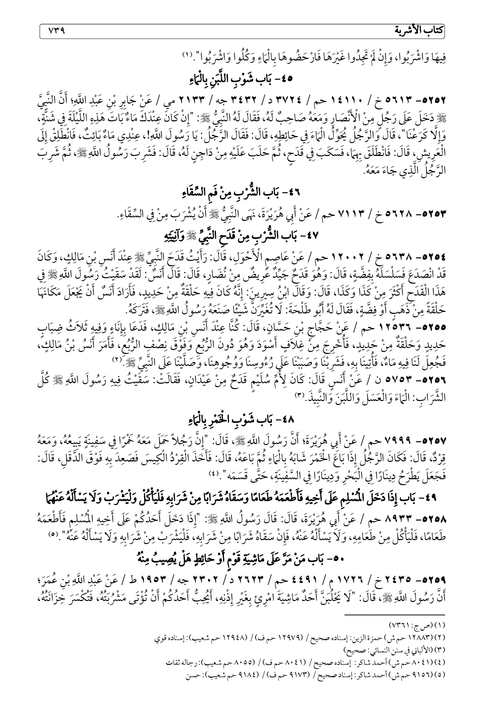 ٥٢٥٢ - ٥٦١٣ خ / ١٤١١٠ حم / ٣٧٢٤ د / ٣٤٣٢ جه / ٢١٣٣ مي / عَنْ جَابِرِ بْنِ عَبْدِ اللَّهِ؛ أَنَّ النَّبِيَّ - صلى الله عليه وسلم - دَخَلَ عَلَى رَجُلٍ مِنْ الْأَنْصَارِ وَمَعَهُ صَاحِبٌ لَهُ، فَقَالَ لَهُ النَّبِيُّ - صلى الله عليه وسلم -: "إِنْ كَانَ عِنْدَكَ مَاءٌ بَاتَ هَذِهِ اللَّيْلَةَ فِي شَنَّةٍ، وَإِلَّا كَرَعْنَا"، قَالَ وَالرَّجُلُ يُحَوِّلُ الْمَاءَ فِي حَائِطِهِ، قَالَ: فَقَالَ الرَّجُلُ: يَا رَسُولَ اللَّهِ!، عِنْدِي مَاءٌ بَائِتٌ، فَانْطَلِقْ إِلَى الْعَرِيشِ، قَالَ: فَانْطَلَقَ بِهِمَا، فَسَكَبَ فِي قَدَحٍ، ثُمَّ حَلَبَ عَلَيْهِ مِنْ دَاجِنٍ لَهُ، قَالَ: فَشَرِبَ رَسُولُ اللَّهِ - صلى الله عليه وسلم -، ثُمَّ شَرِبَ الرَّجُلُ الَّذِي جَاءَ مَعَهُ.