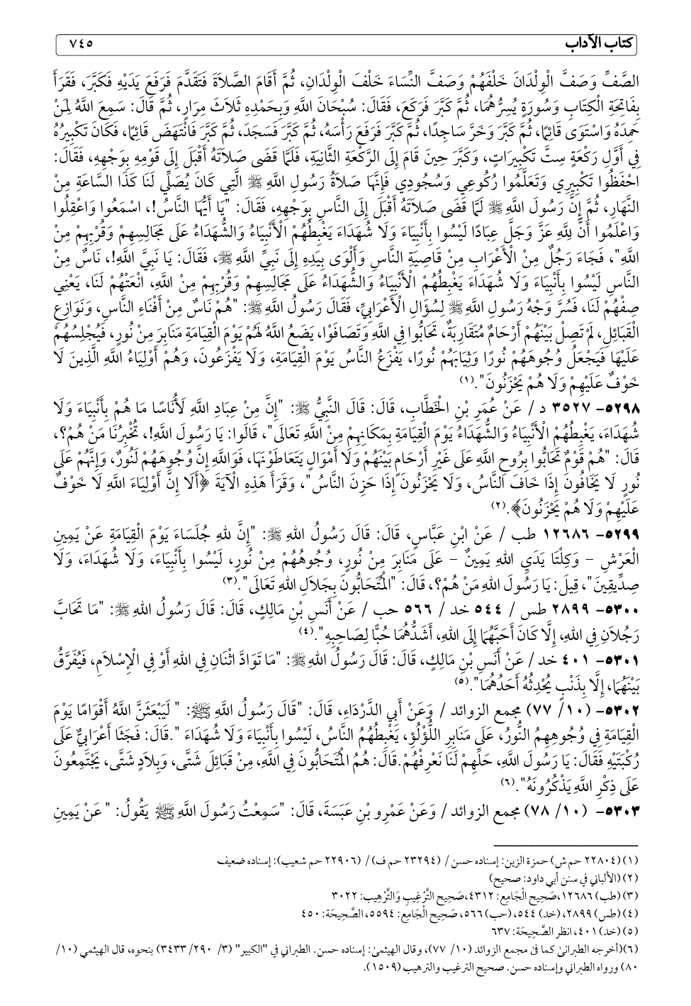 ٥٢٩٨ - ٣٥٢٧ د / عَنْ عُمَرِ بْنِ الْخَطَّابِ، قَالَ: قَالَ النَّبِيُّ - صلى الله عليه وسلم -: "إِنَّ مِنْ عِبَادِ اللَّهِ لَأُنَاسًا مَا هُمْ بِأَنْبِيَاءَ وَلَا شُهَدَاءَ، يَغْبِطُهُمْ الْأَنْبِيَاءُ وَالشُّهَدَاءُ يَوْمَ الْقِيَامَةِ بِمَكَانِهِمْ مِنْ اللَّهِ تَعَالَى"، قَالَوا: يَا رَسُولَ اللَّهِ!، تُخْبِرُنَا مَنْ هُمْ؟، قَالَ: "هُمْ قَوْمٌ تَحَابُّوا بِرُوحِ اللَّهِ عَلَى غَيْرِ أَرْحَامٍ بَيْنَهُمْ وَلَا أَمْوَالٍ يَتَعَاطَوْنَهَا، فَوَاللَّهِ إِنَّ وُجُوهَهُمْ لَنُورٌ، وَإِنَّهُمْ عَلَى نُورٍ لَا يَخَافُونَ إِذَا خَافَ النَّاسُ، وَلَا يَحْزَنُونَ إِذَا حَزِنَ النَّاسُ"، وَقَرَأَ هَذِهِ الْآيَةَ {أَلَا إِنَّ أَوْلِيَاءَ اللَّهِ لَا خَوْفٌ عَلَيْهِمْ وَلَا هُمْ يَحْزَنُونَ}. (¬٢)