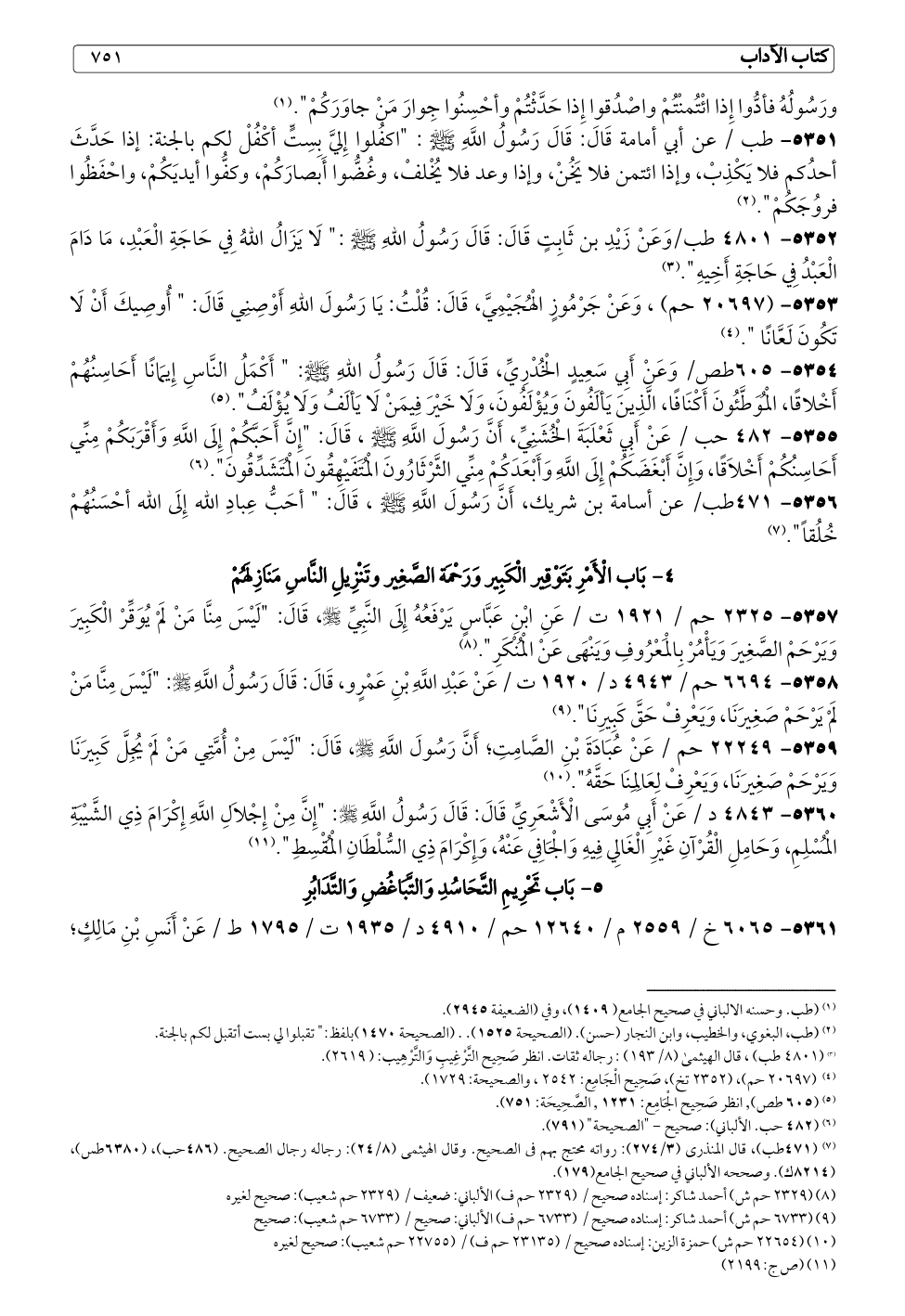 (¬٧) (٤٧١ طب)، قال المنذرى (٣/ ٢٧٤): رواته محتج بهم فى الصحيح. وقال الهيثمى (٨/ ٢٤): رجاله رجال الصحيح. (٤٨٦ حب)، (٦٣٨٠ طس)، (٨٢١٤ ك). وصححه الألباني في صحيح الجامع (١٧٩).