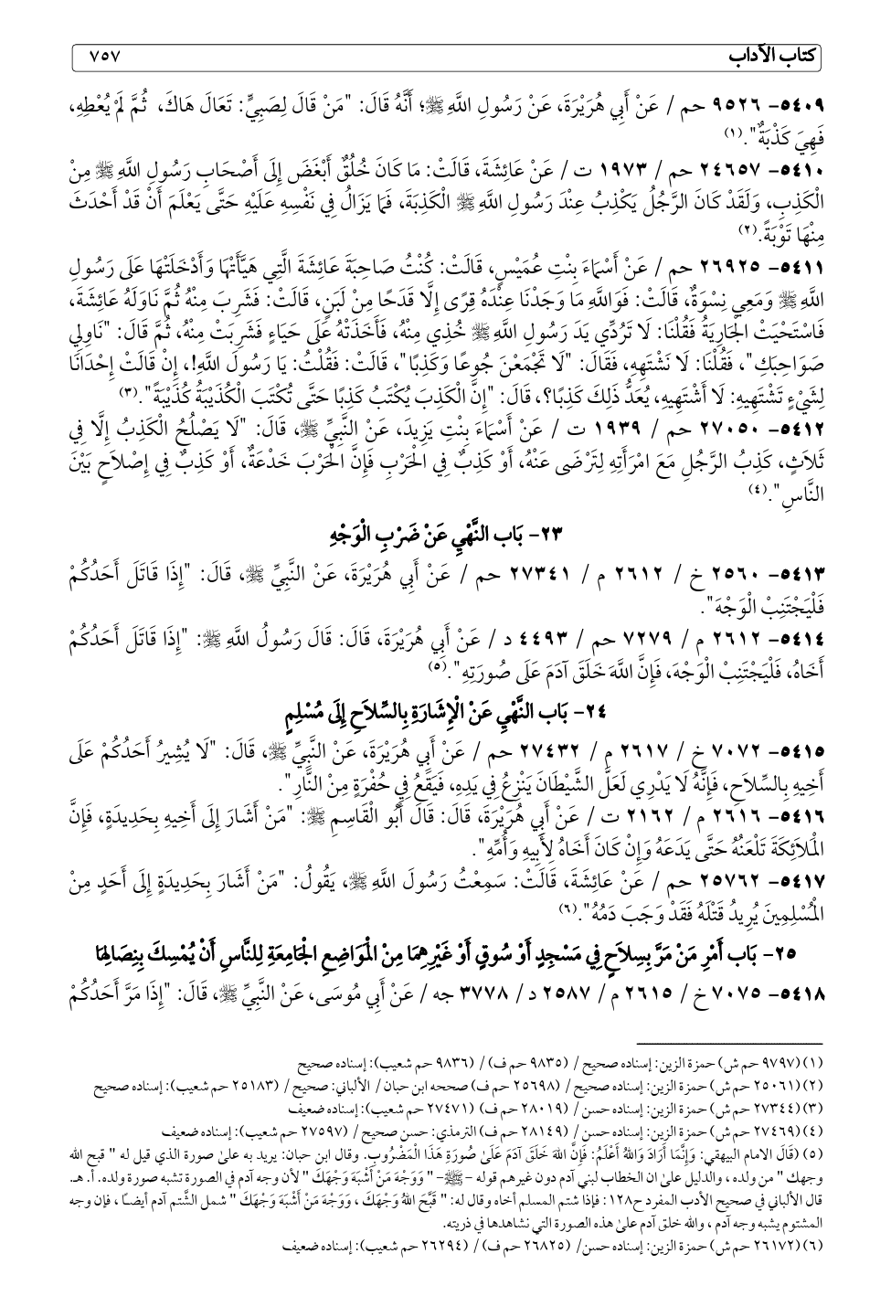 ٥٤١٦ - ٢٦١٦ م / ٢١٦٢ ت / عَنْ أَبِي هُرَيْرَةَ، قَالَ: قَالَ أَبُو الْقَاسِمِ - صلى الله عليه وسلم -: "مَنْ أَشَارَ إِلَى أَخِيهِ بِحَدِيدَةٍ، فَإِنَّ الْمَلَائِكَةَ تَلْعَنُهُ حَتَّى يَدَعَهُ وَإِنْ كَانَ أَخَاهُ لِأَبِيهِ وَأُمِّهِ".