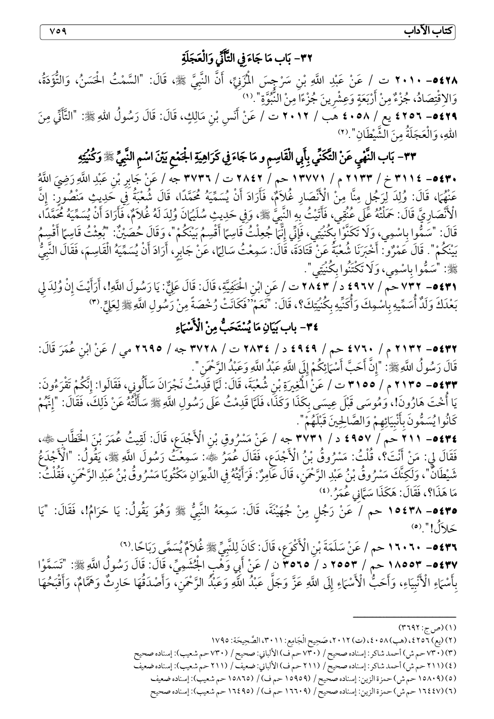 ٥٤٣٠ - ٣١١٤ خ / ٢١٣٣ م / ١٣٧٧١ حم / ٢٨٤٢ ت / ٣٧٣٦ جه / عَنْ جَابِرِ بْنِ عَبْدِ اللَّهِ رَضِيَ اللَّهُ عَنْهُمَا، قَالَ: وُلِدَ لِرَجُلٍ مِنَّا مِنْ الْأَنْصَارِ غُلَامٌ، فَأَرَادَ أَنْ يُسَمِّيَهُ مُحَمَّدًا، قَالَ شُعْبَةُ فِي حَدِيثِ مَنْصُورٍ: إِنَّ الْأَنْصَارِيَّ قَالَ: حَمَلْتُهُ عَلَى عُنُقِي، فَأَتَيْتُ بِهِ النَّبِيَّ - صلى الله عليه وسلم -، وَفِي حَدِيثِ سُلَيْمَانَ وُلِدَ لَهُ غُلَامٌ، فَأَرَادَ أَنْ يُسَمِّيَهُ مُحَمَّدًا، قَالَ: "سَمُّوا بِاسْمِي، وَلَا تَكَنَّوْا بِكُنْيَتِي، فَإِنِّي إِنَّمَا جُعِلْتُ قَاسِمًا أَقْسِمُ بَيْنَكُمْ"، وَقَالَ حُصَيْنٌ: "بُعِثْتُ قَاسِمًا أَقْسِمُ بَيْنَكُمْ". قَالَ عَمْرٌو: أَخْبَرَنَا شُعْبَةُ عَنْ قَتَادَةَ، قَالَ: سَمِعْتُ سَالِمًا، عَنْ جَابِرٍ، أَرَادَ أَنْ يُسَمِّيَهُ الْقَاسِمَ، فَقَالَ النَّبِيُّ - صلى الله عليه وسلم -: "سَمُّوا بِاسْمِي، وَلَا تَكْتَنُوا بِكُنْيَتِي".